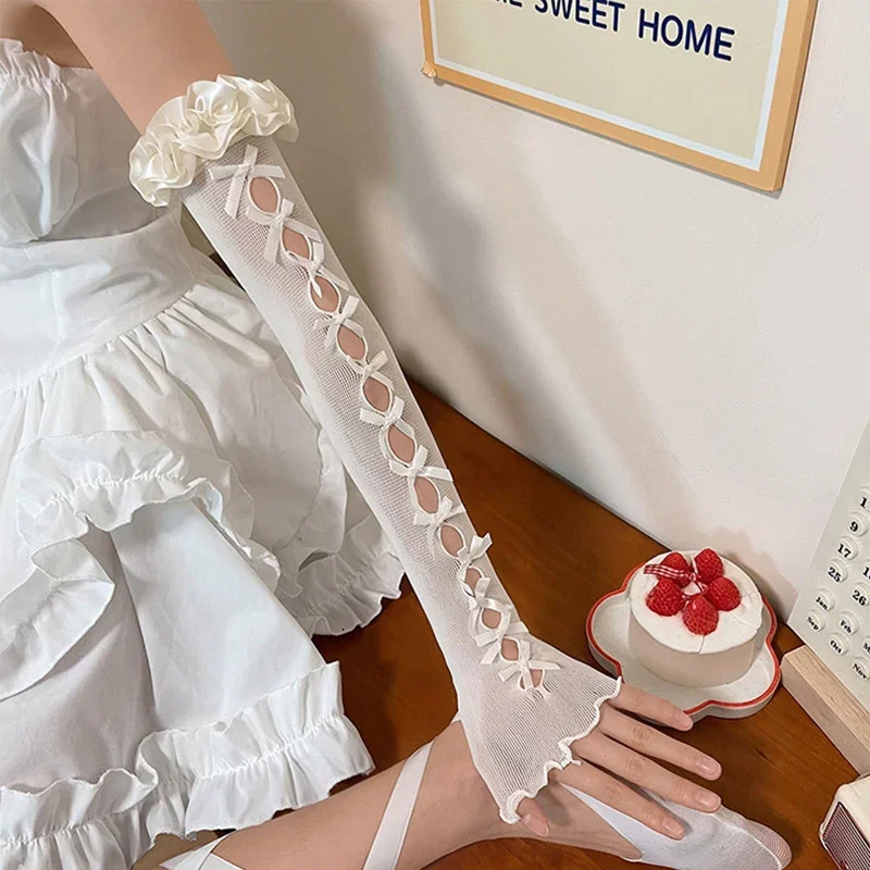 LIZAKOSHT - Lolita Mesh Flock Sleeves Women Sweet Girls Y2K Lace Bow Arm Cuff Cover Gothic Satin Flower Punk Long Gloves Oversleeve