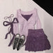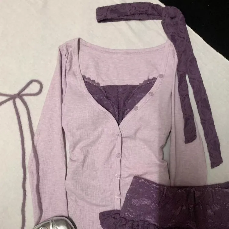 LIZAKOSHT  -  Lolita Sweet Skirt Set Women Purple Patchwork Long Sleeve Cardigan Layered High Waisted Pretty Style Mini Lace Skirt