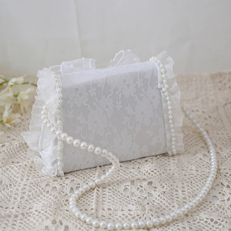 LIZAKOSHT - Lolita White Lace Bag Pearl Chain Purse Bowknot Handbag Sweet Tea Party Shoulder Bag Kawaii Girls Cute Bows Butterfly