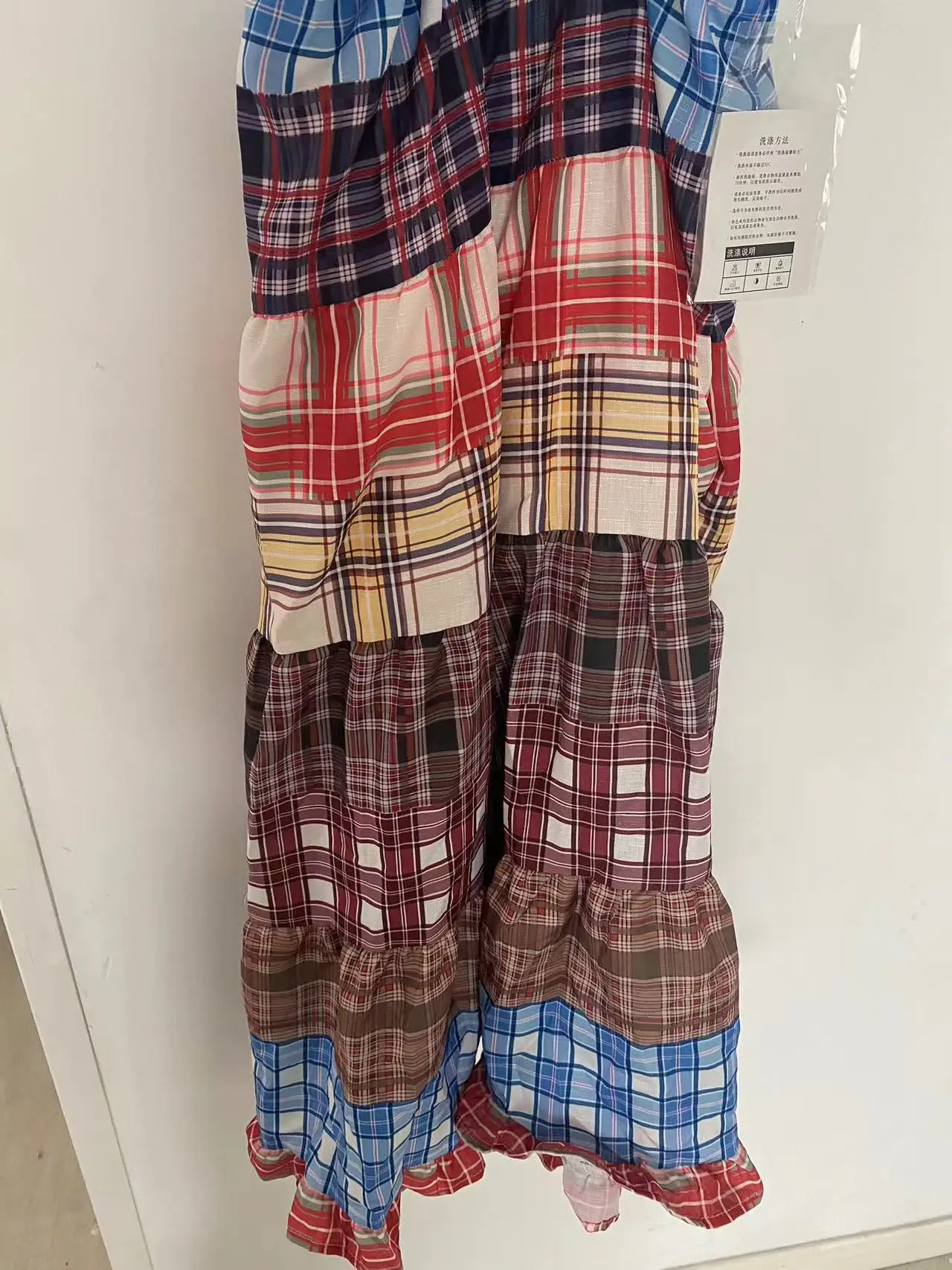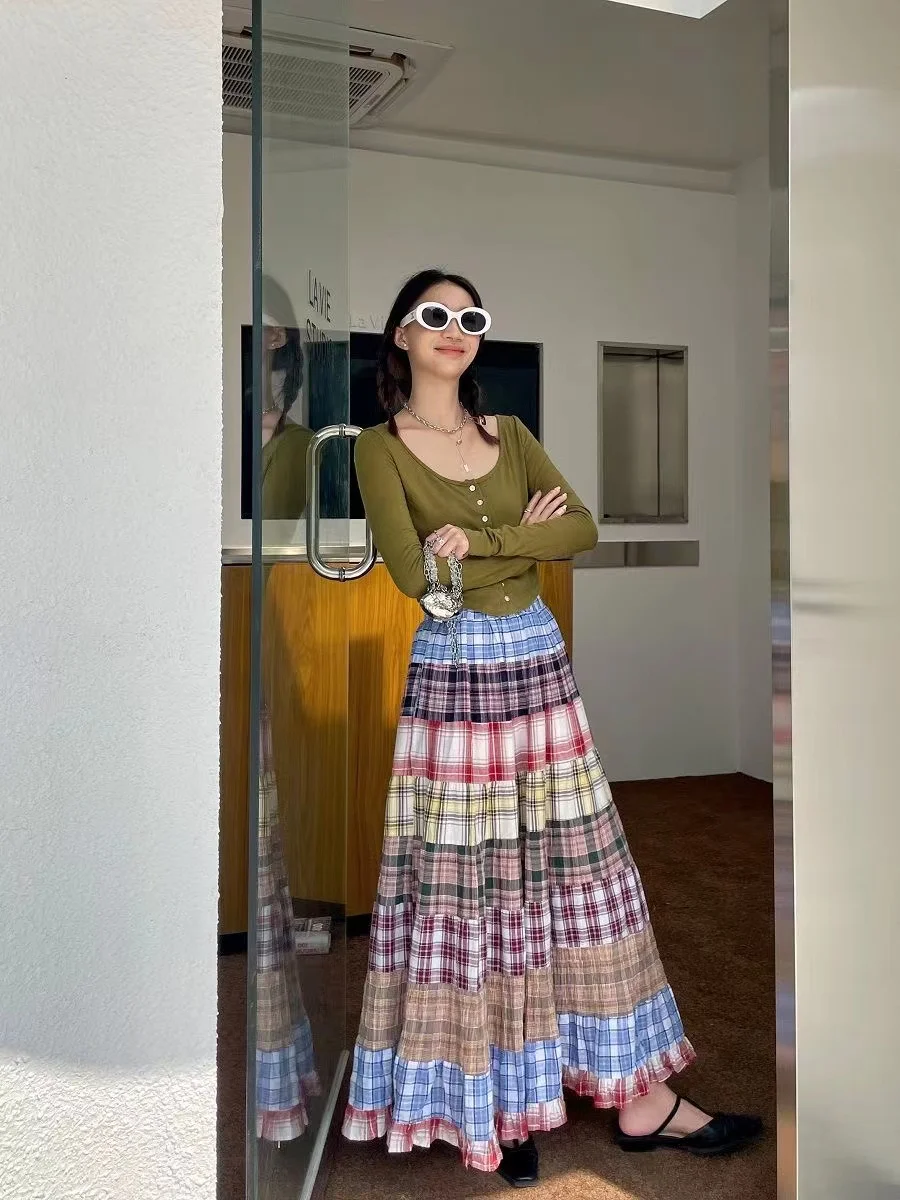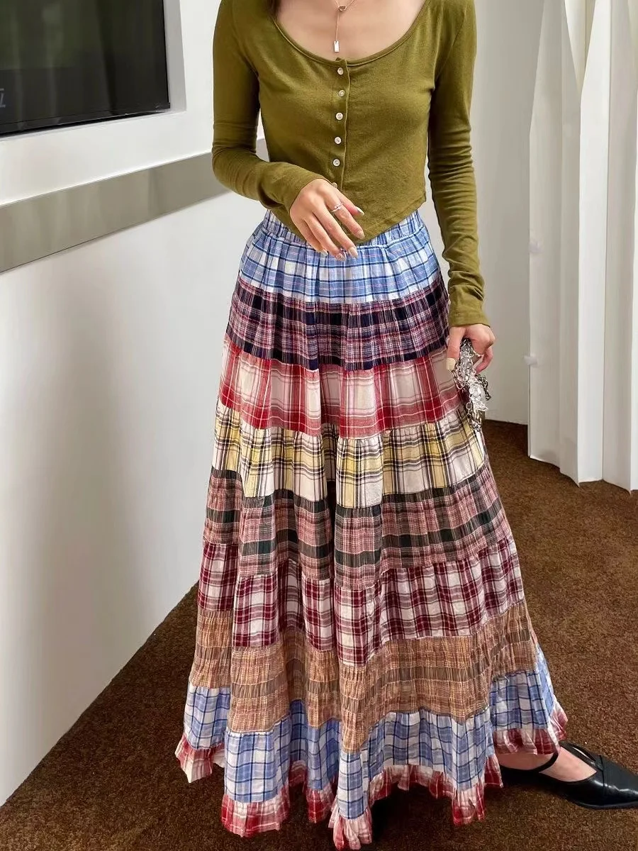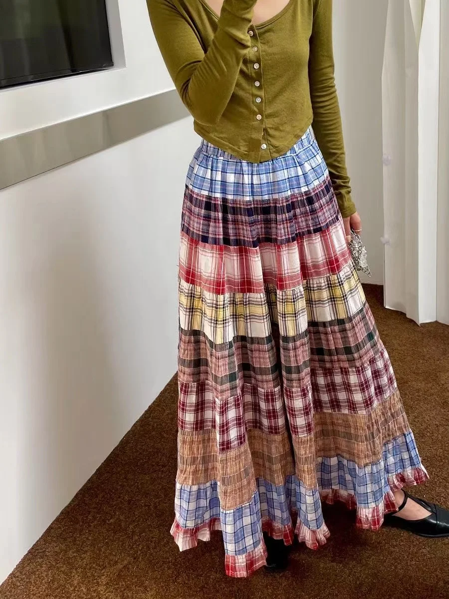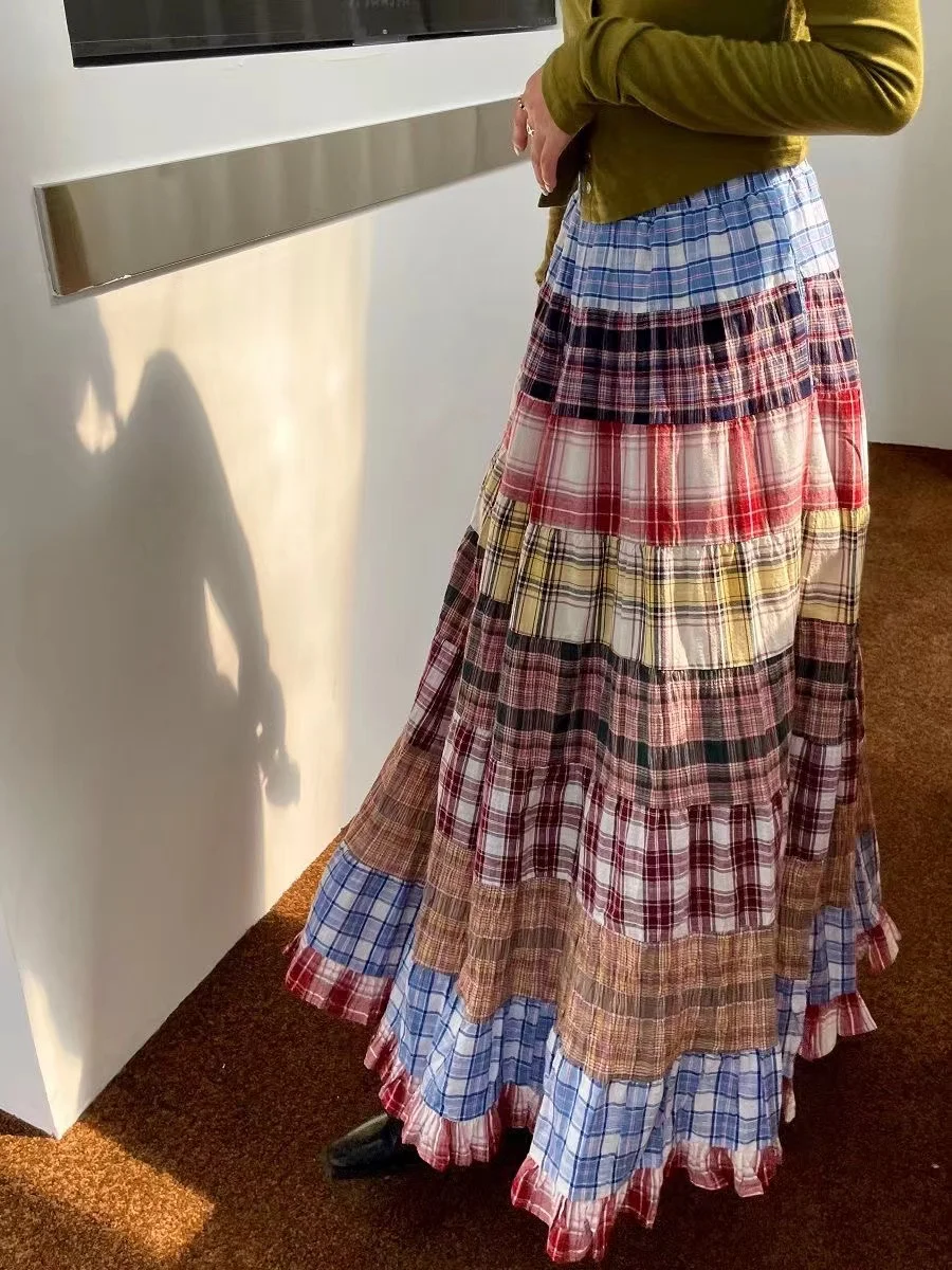 LIZAKOSHT long skirts for women fashion autumn Spain style long bohemian plaid patchwork a-line skirt