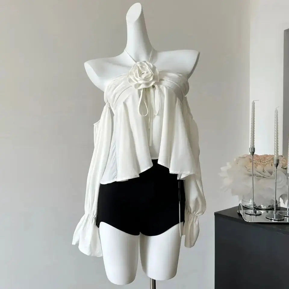 LIZAKOSHT - Long Sleeves High Quality Chiffon Blouses Floral Sweet Women Crop Top One-Piece Collar Kawaii Korean Shirt Puff Sleeve Top