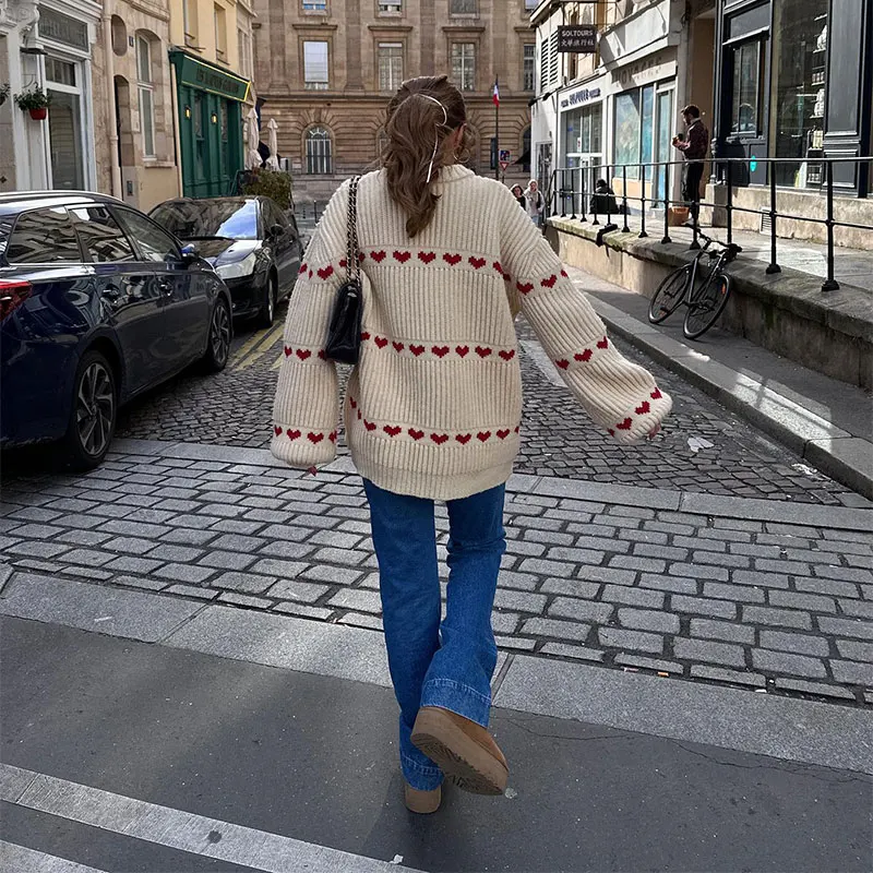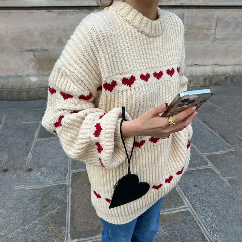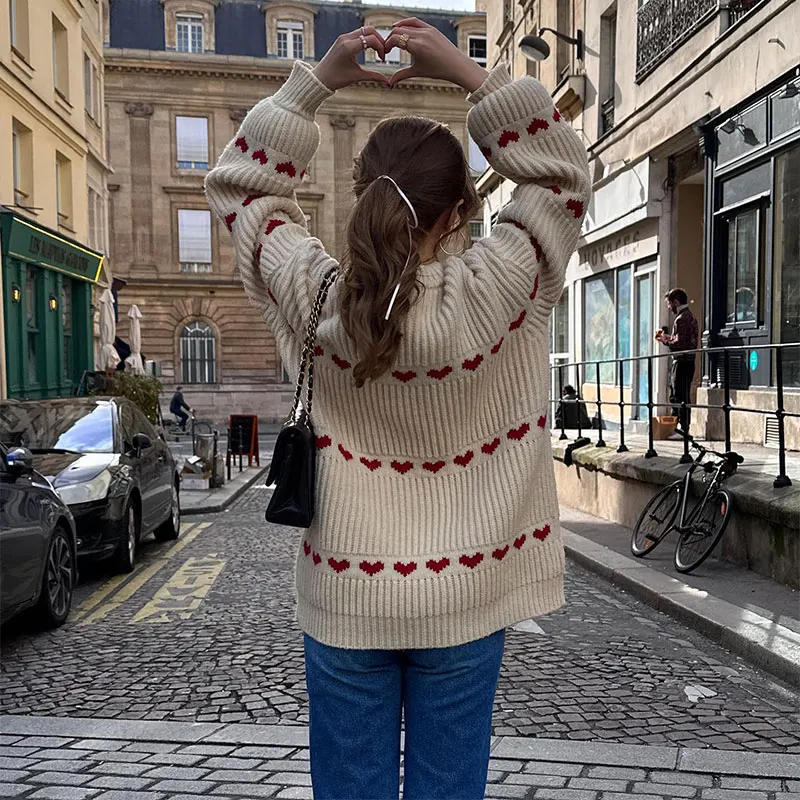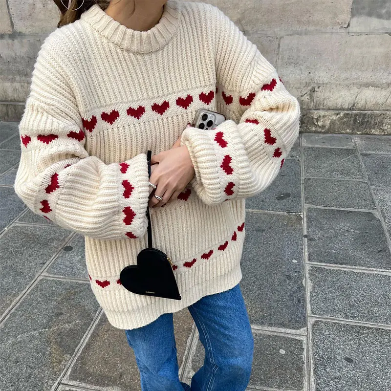 LIZAKOSHT Love Heart Printed Ribbed Knitted Sweater Women Loose Long Sleeve Thick Warm Pullover Autumn Fashion Female Commuter Jumper