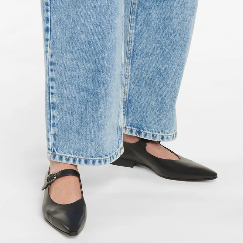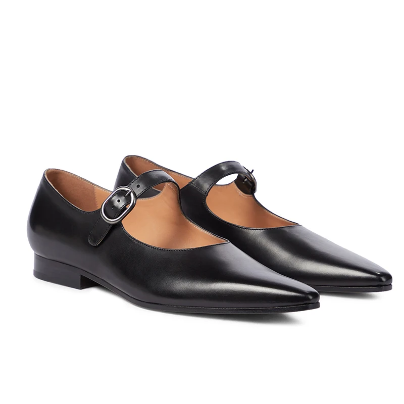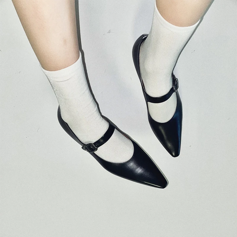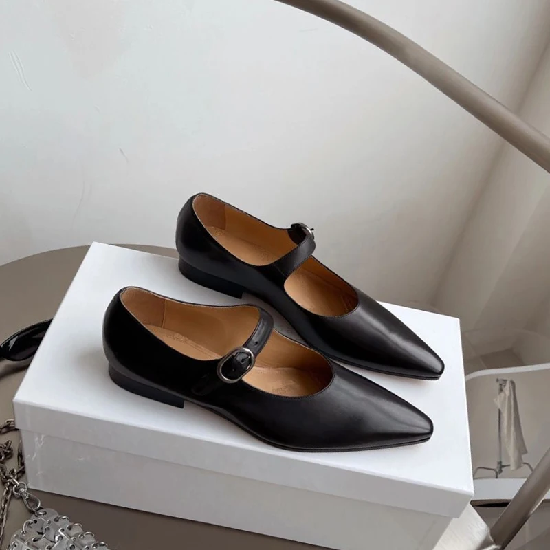 LIZAKOSHT - Mary Jane Shoes Black French Style Leather Shoes Women's Summer Chunky Heel Pointed-Toe Shoes Flat Ankle-Strap Buckle New