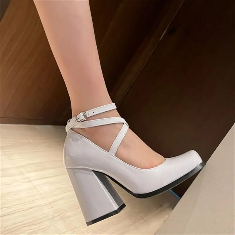 LIZAKOSHT - Mary Janes Patent Leather Square Toe Cross Tie High Heels Women Pumps Buckle Strap Shallow Popular Classic Sweet Female Shoes