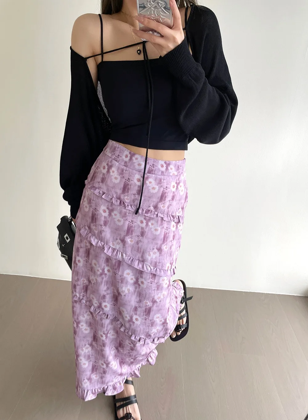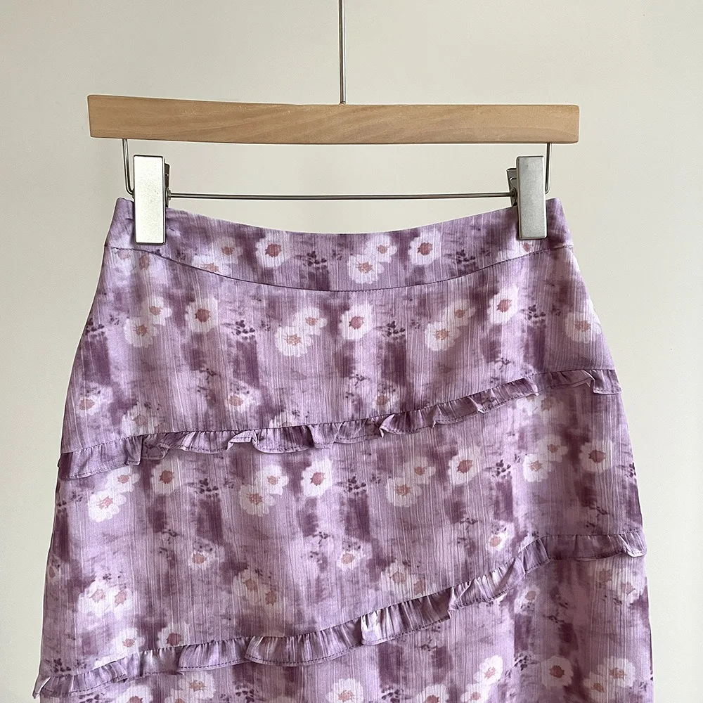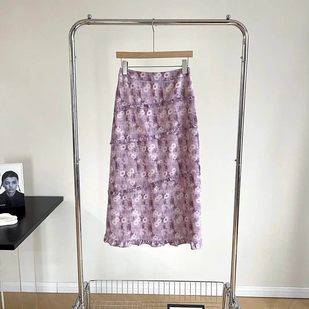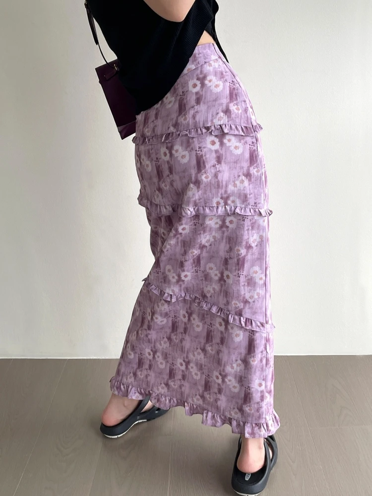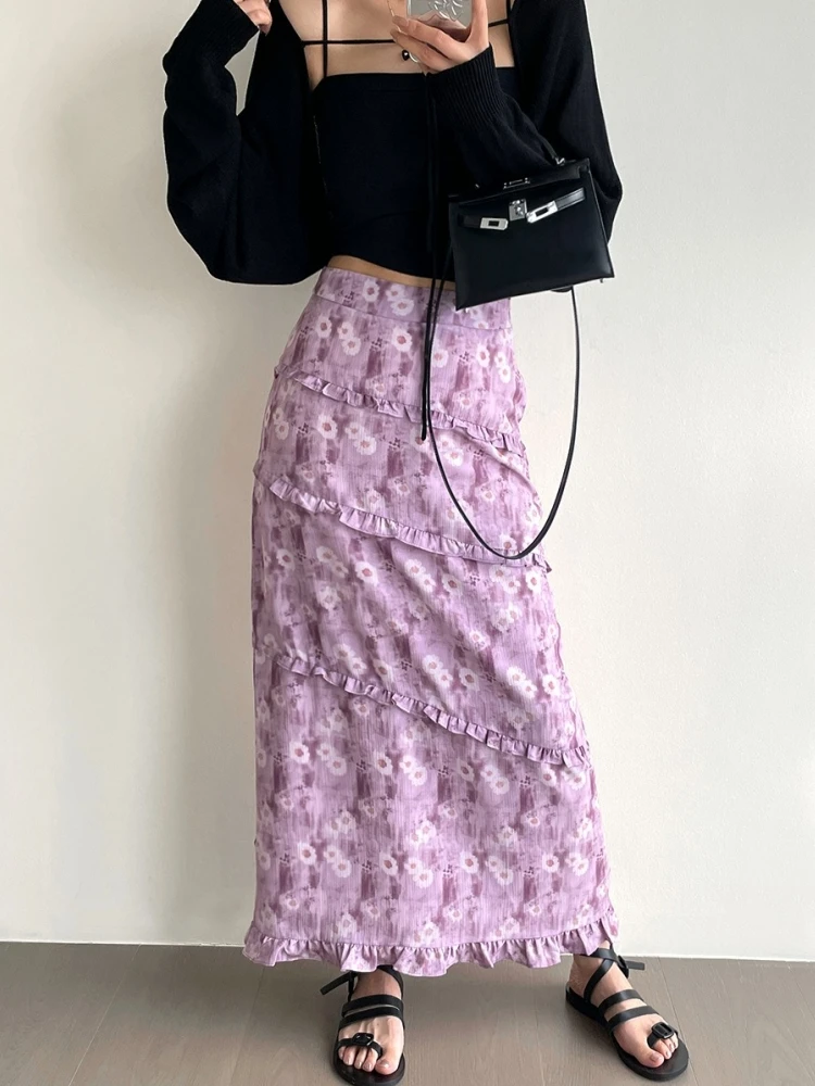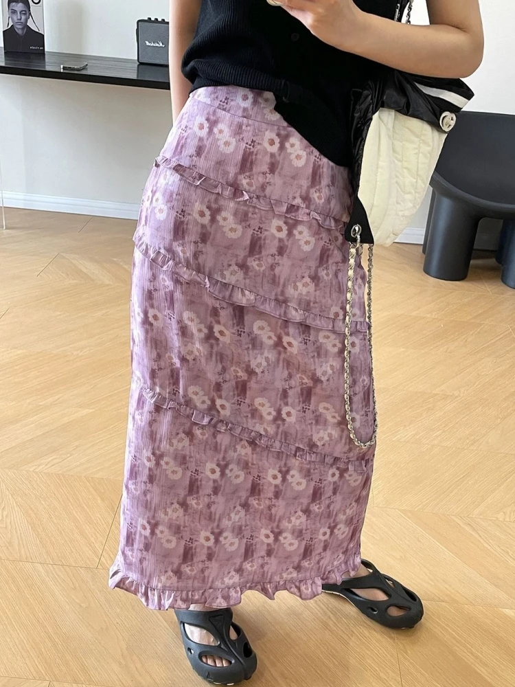 Lizakosht Midi Long Skirts Womens Printing Skirt Summer Korean Casual High Waist High Low Ruched Ruffle Skirts rok