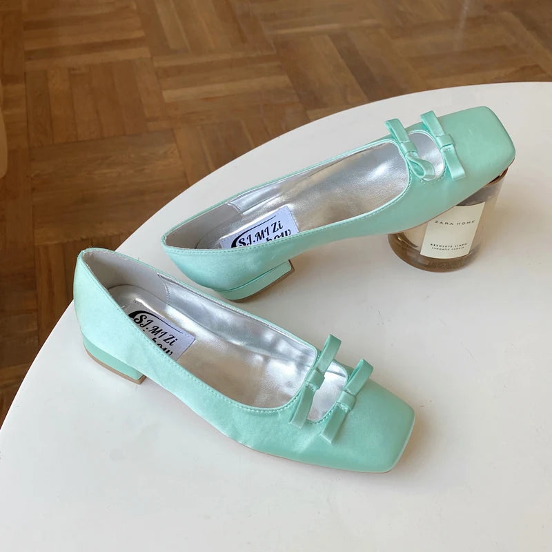 Lizakosht Mint green satin single shoe square toe bow low heel comfortable versatile Mary Jane shoes