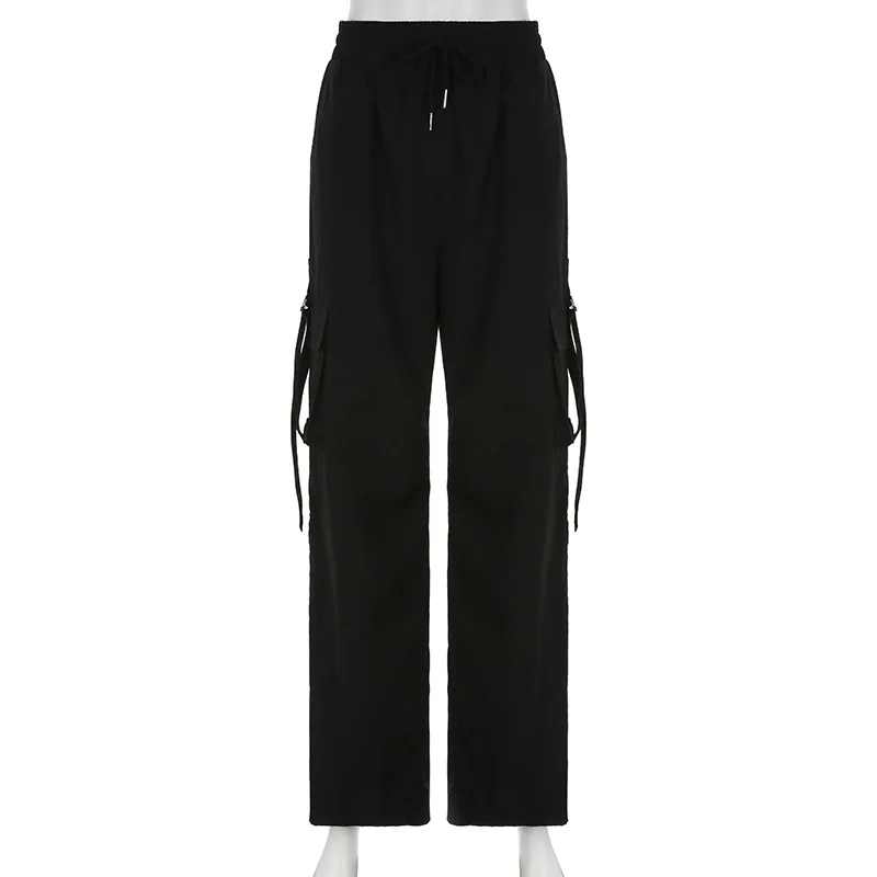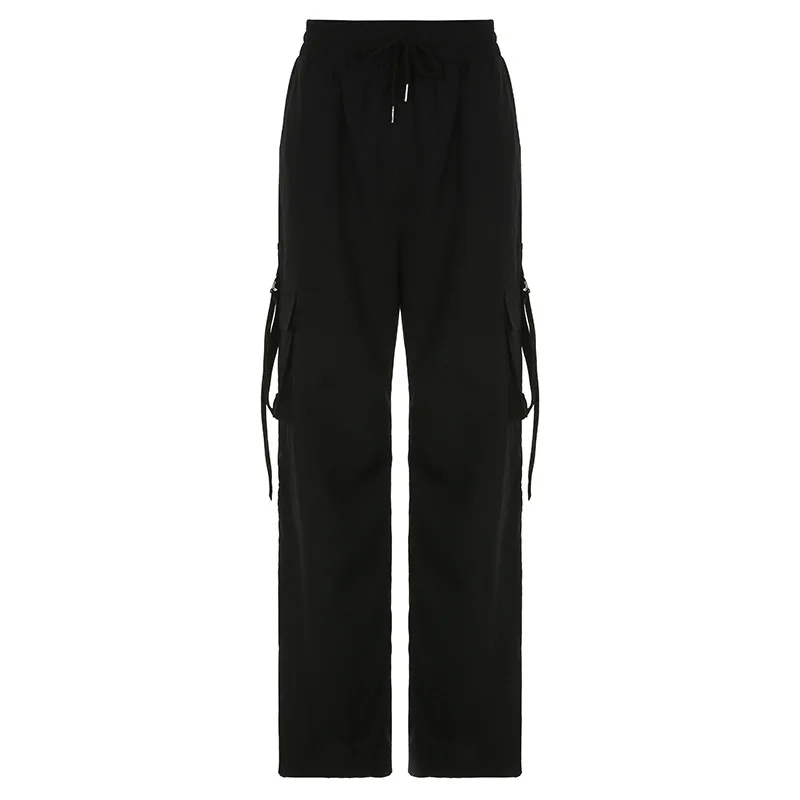Lizakosht Multi Pocket Black Cargo Pants Hip Hop Streetwear Baggy Drawstring Grunge Straight Leg Sweatpants Women Carpenter Trousers