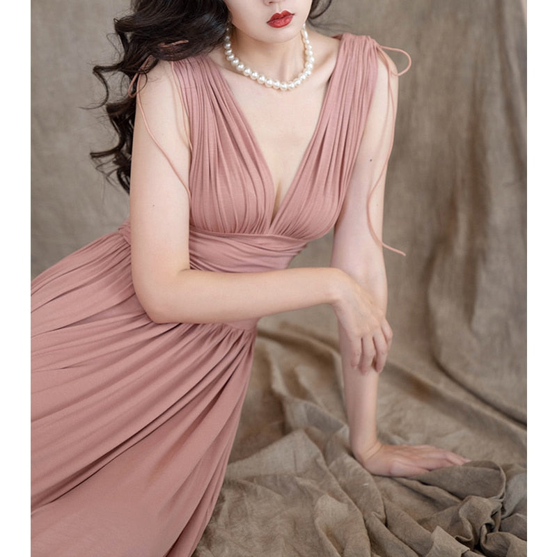 Lizakosht New Elegant Womens Dress V-neck High Stretch Sleeveless Bodycon Dress Vintage High Waisted Sexy Party Women's Clothing Evening