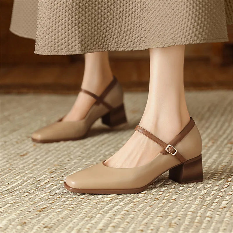 LIZAKOSHT New Genuine Leather Vintage Women Shoes Fashion Square Toe Pumps Chunky Heel Spring Shoes Women Zapatos De Mujer Mary Jane Shoes