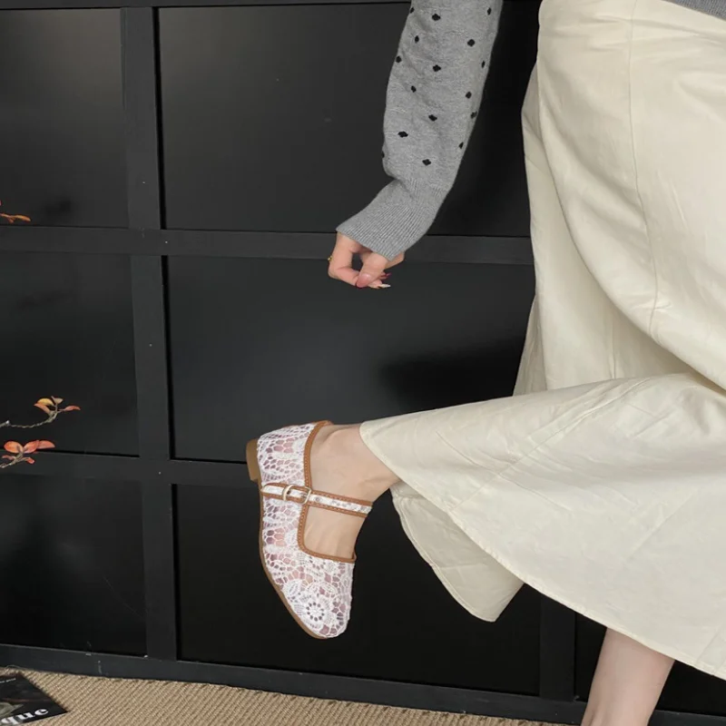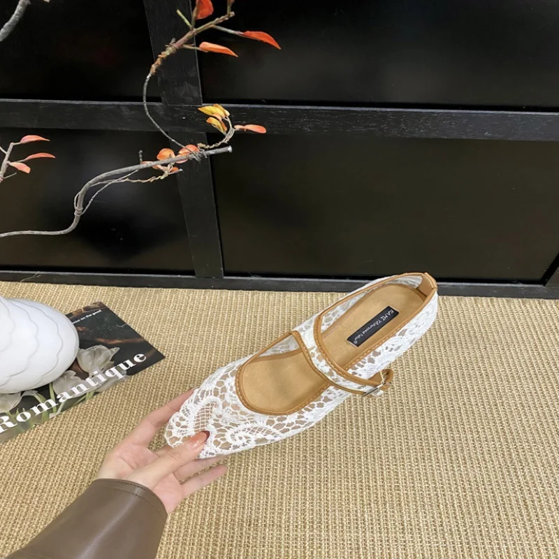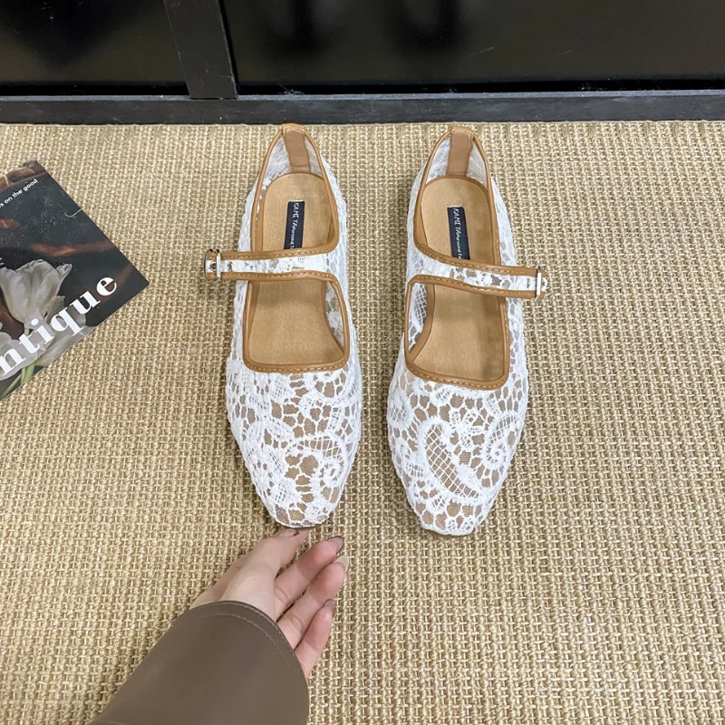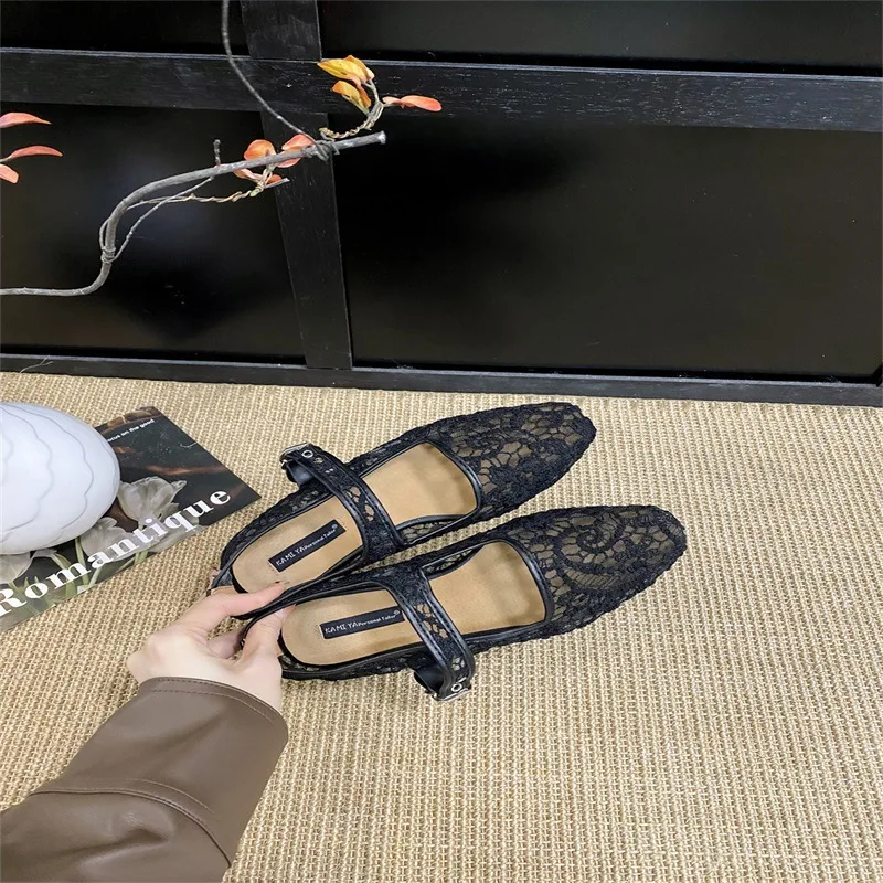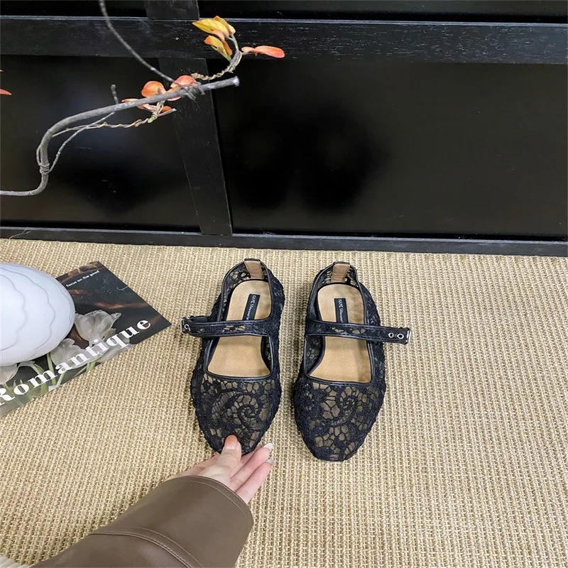 LIZAKOSHT - NEW Lace Women Mary Jane Shoes Fashion Shallow Buckle Comfort Soft Female Street Style Breathable Mesh Flats Sandals