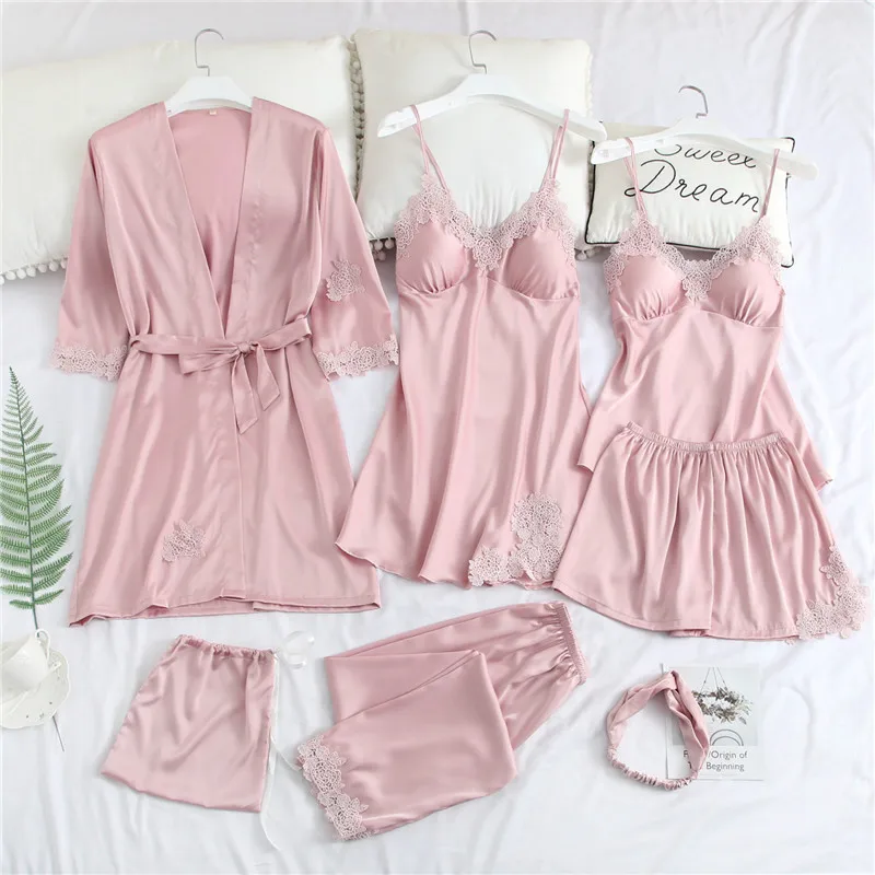 Lizakosht New Satin Pajamas Set for Women Sleepwear 7 pcs Female Lace Silk Pyjamas Suit Summer Autumn Lingerie Homewear Pijamas
