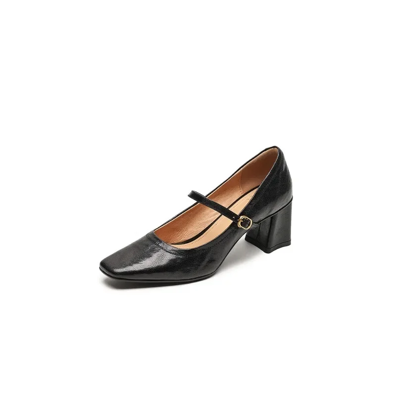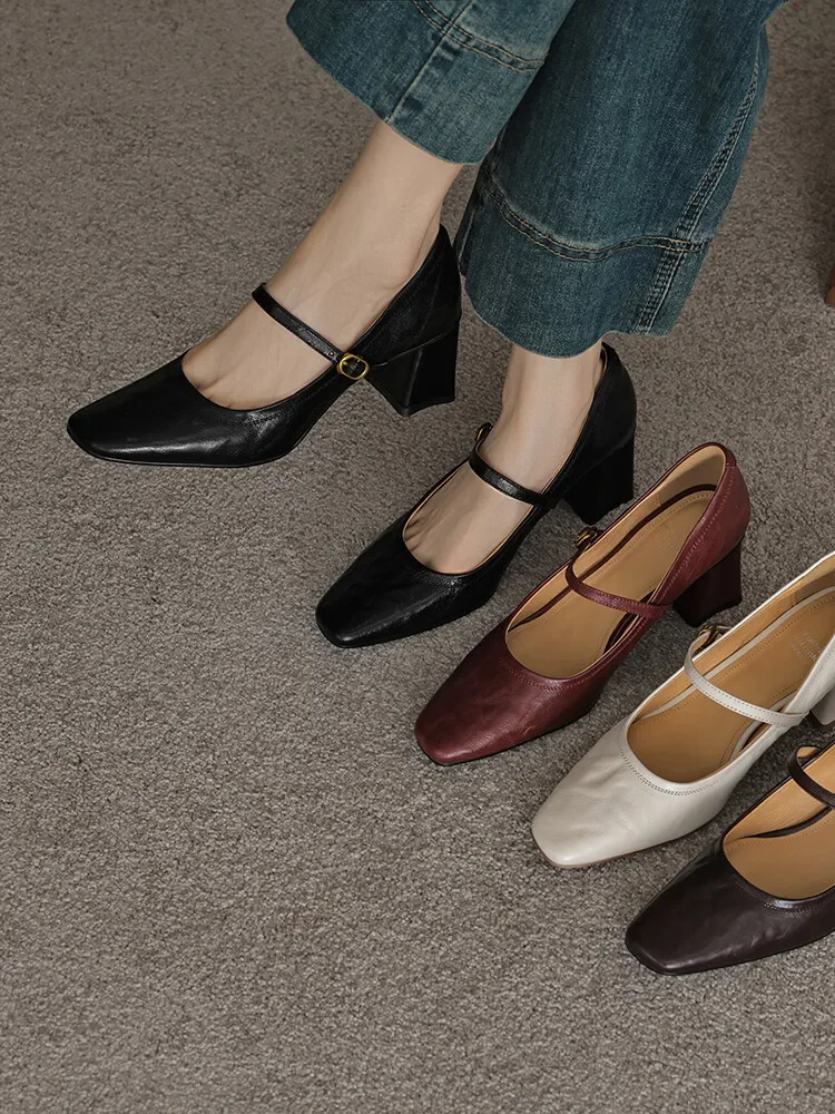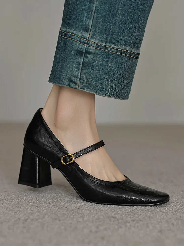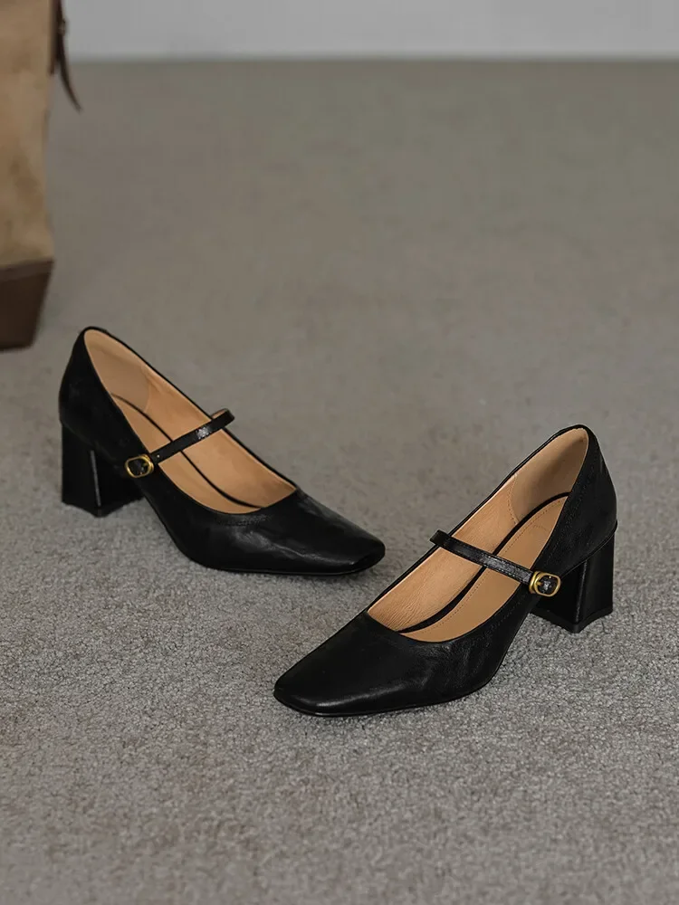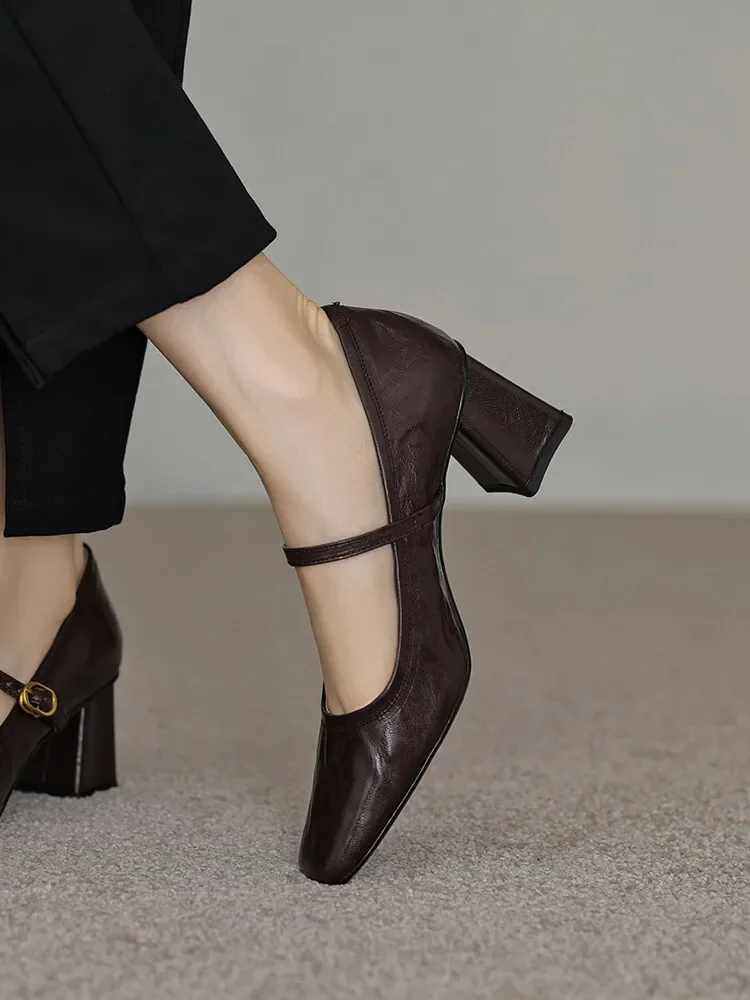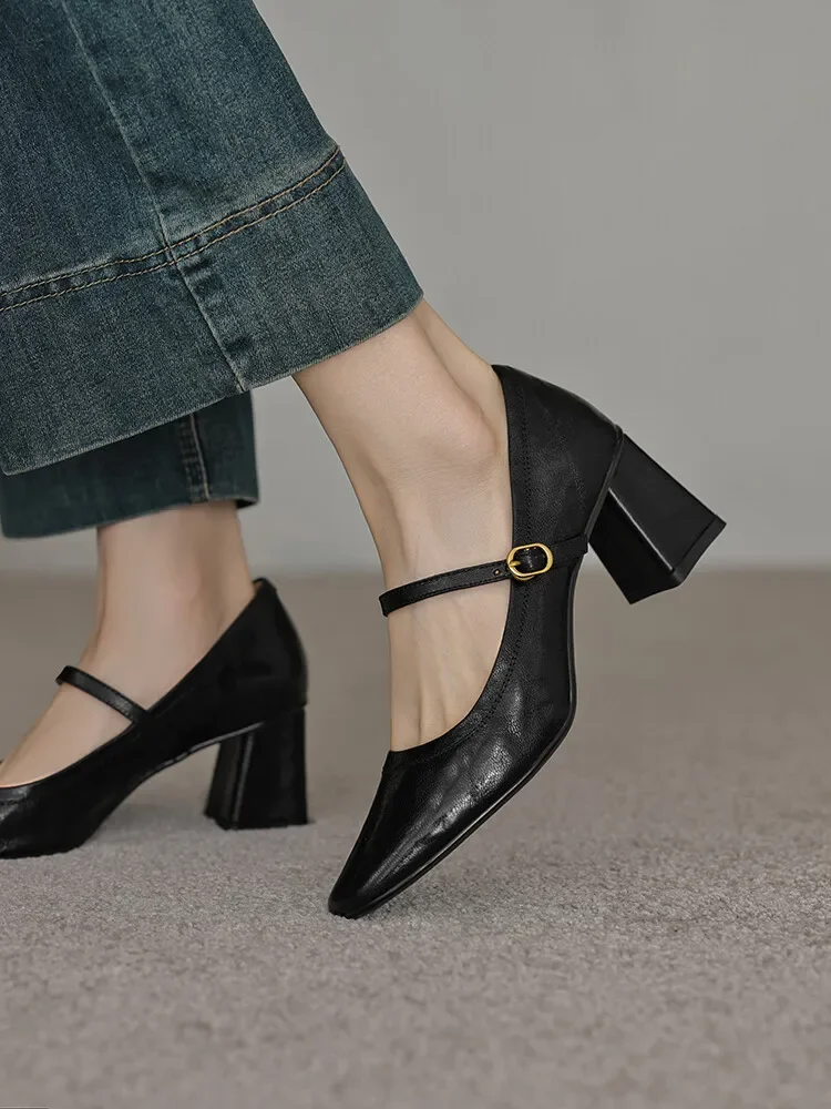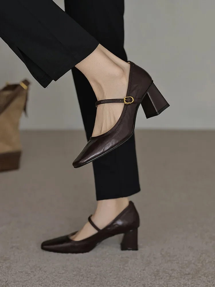 LIZAKOSHT - New square toe shallow mouth classic with leather upper and simple style Thick Heel shoes