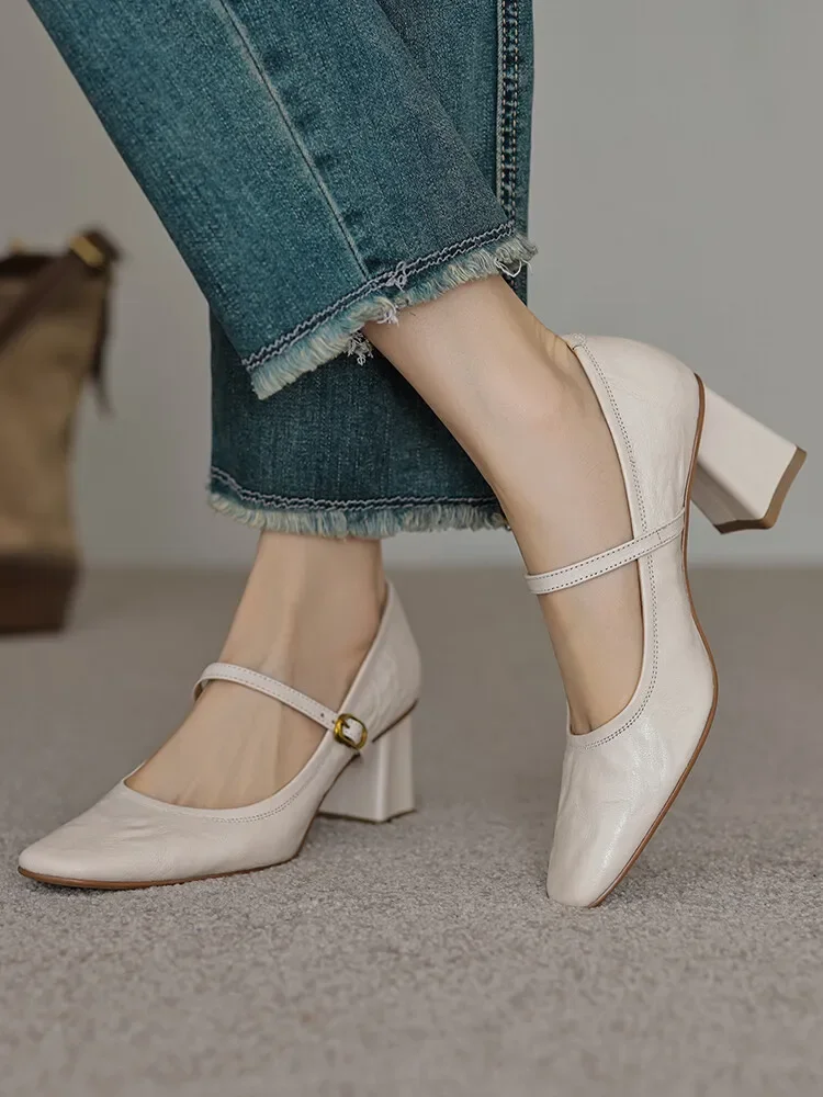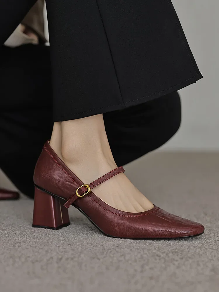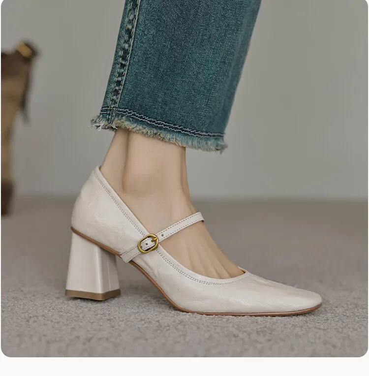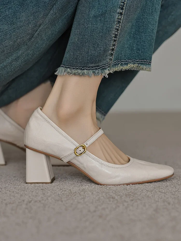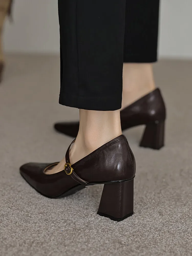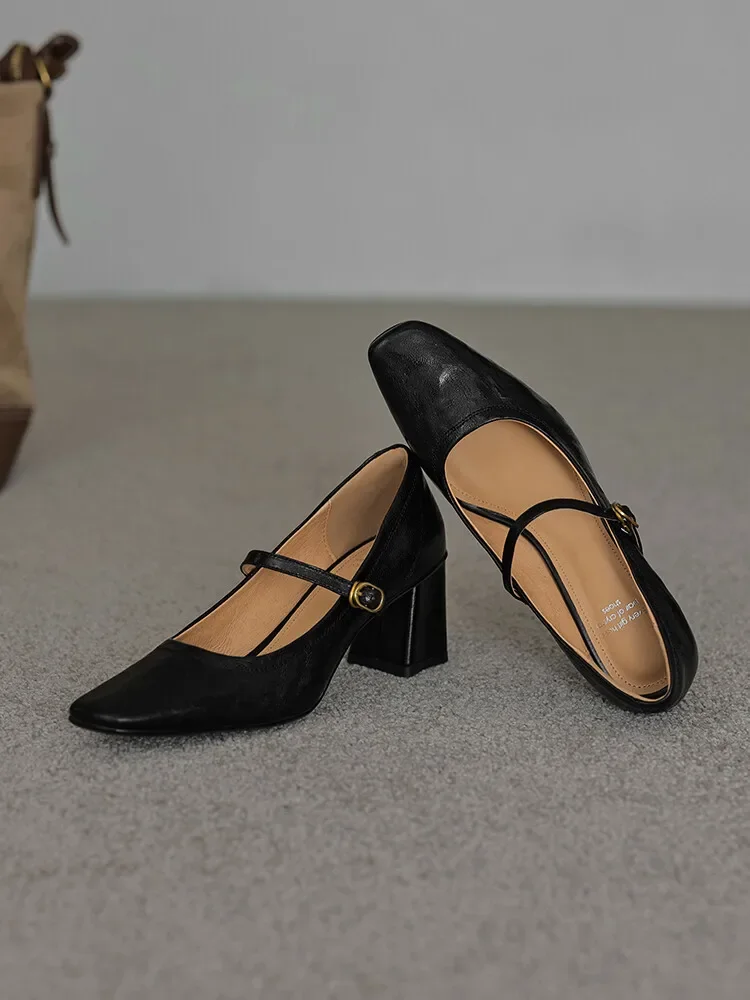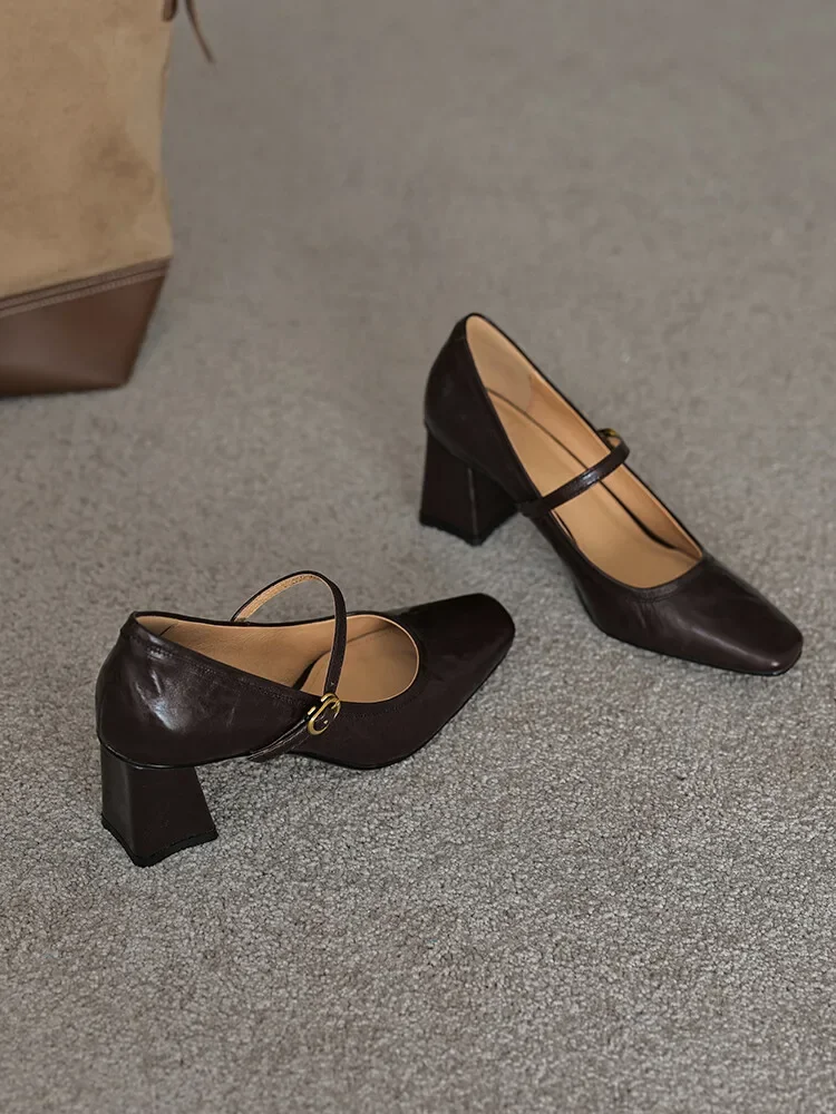 LIZAKOSHT - New square toe shallow mouth classic with leather upper and simple style Thick Heel shoes