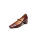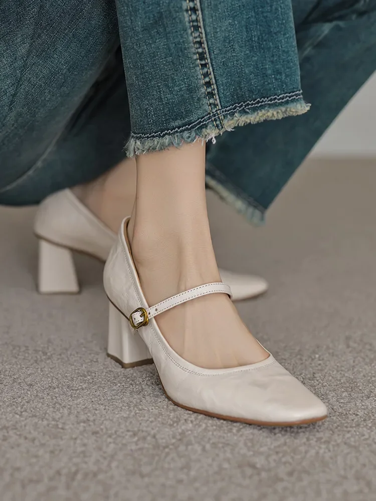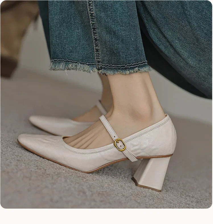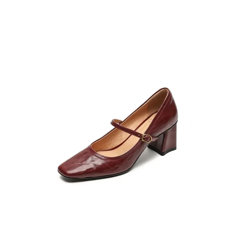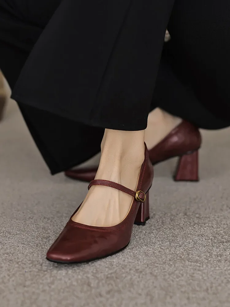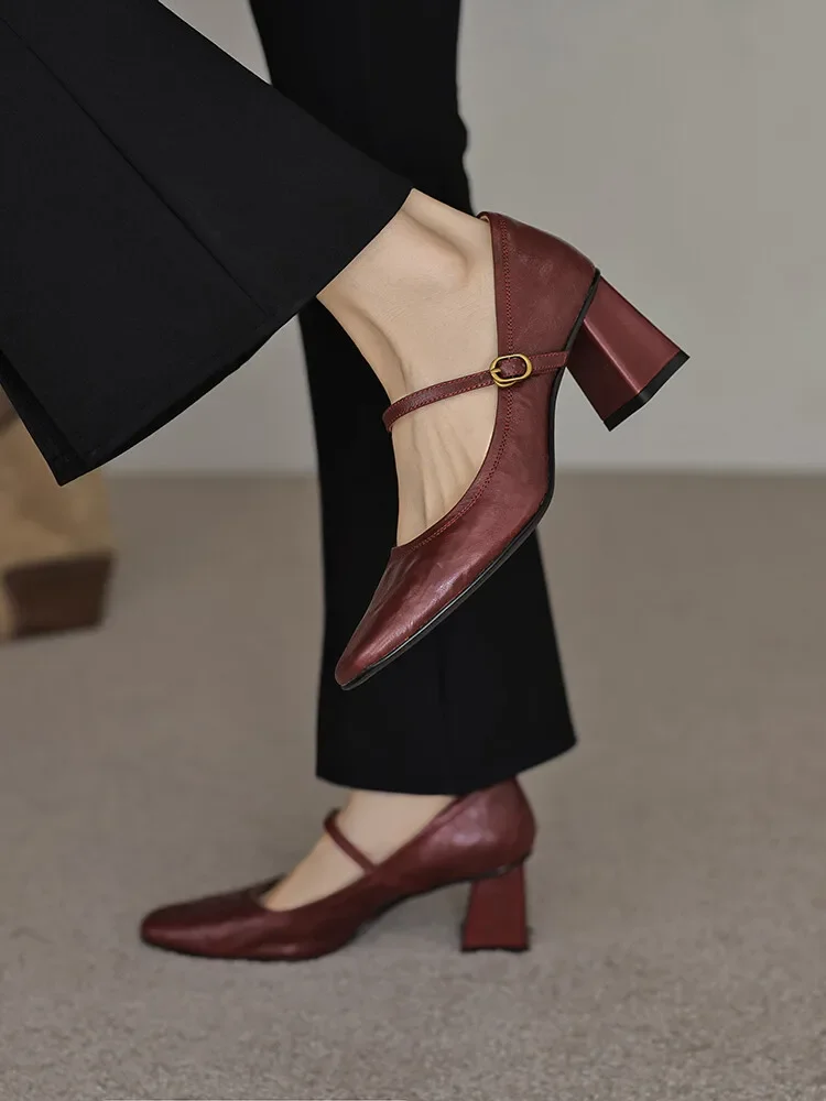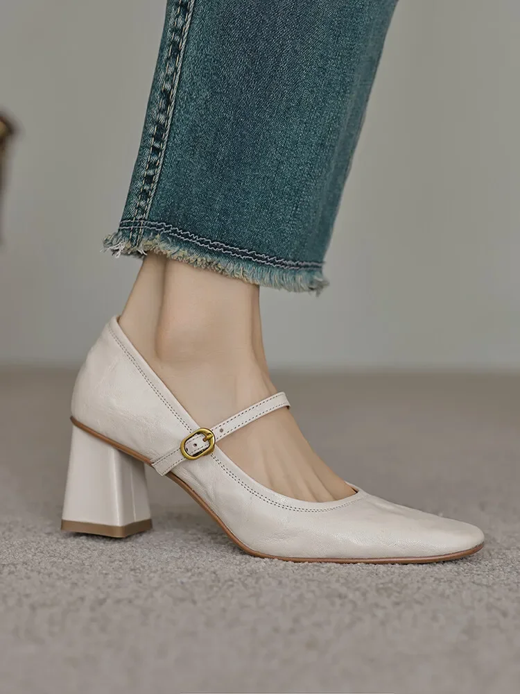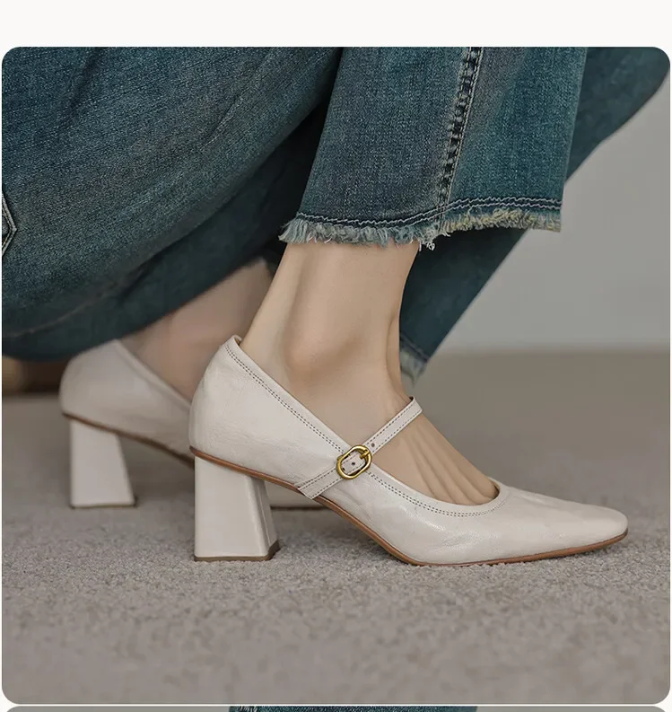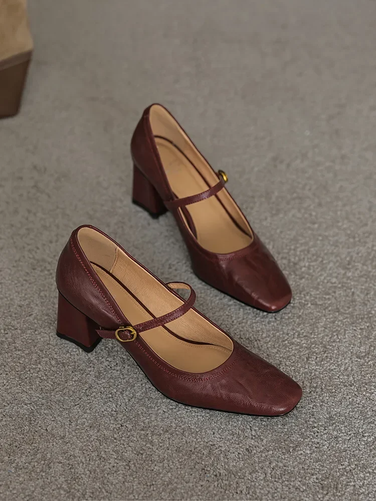LIZAKOSHT - New square toe shallow mouth classic with leather upper and simple style Thick Heel shoes