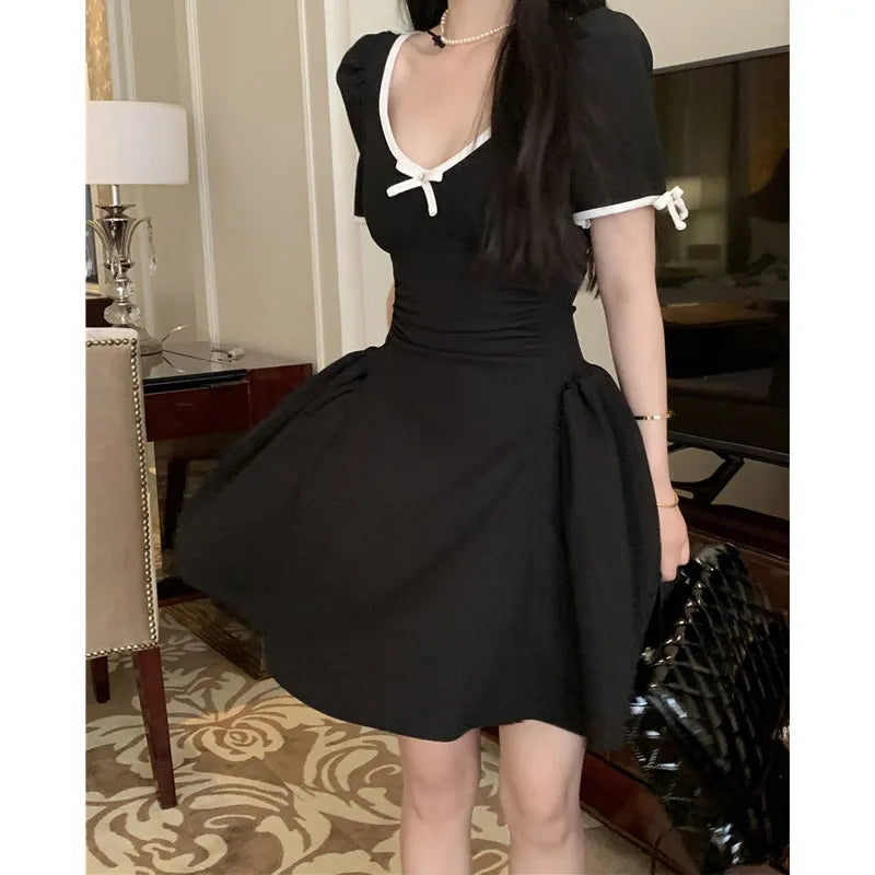 LIZAKOSHT - New Summer Sweet Y2k Black Mini Dress Sexy Bow V Neck Women Party Backless Dress Retro Hollow Out Dress Korean Vestido Sundress
