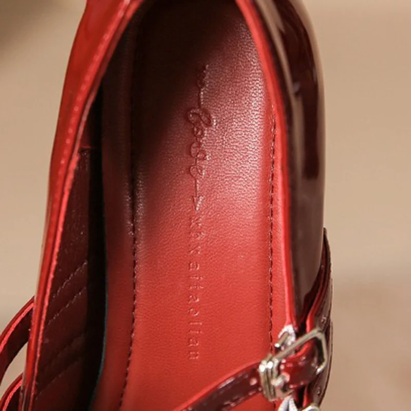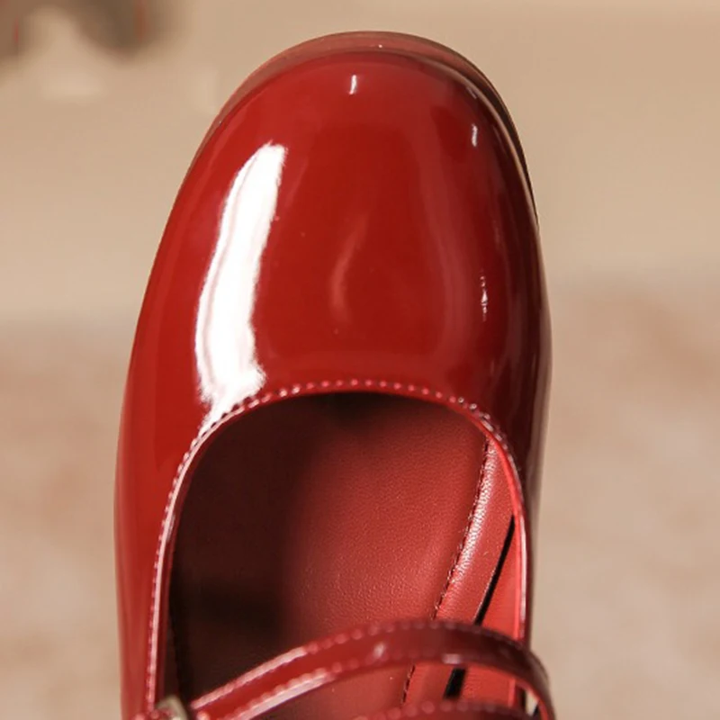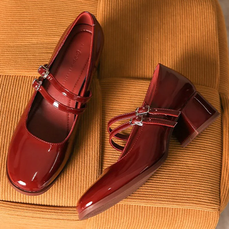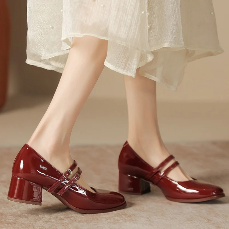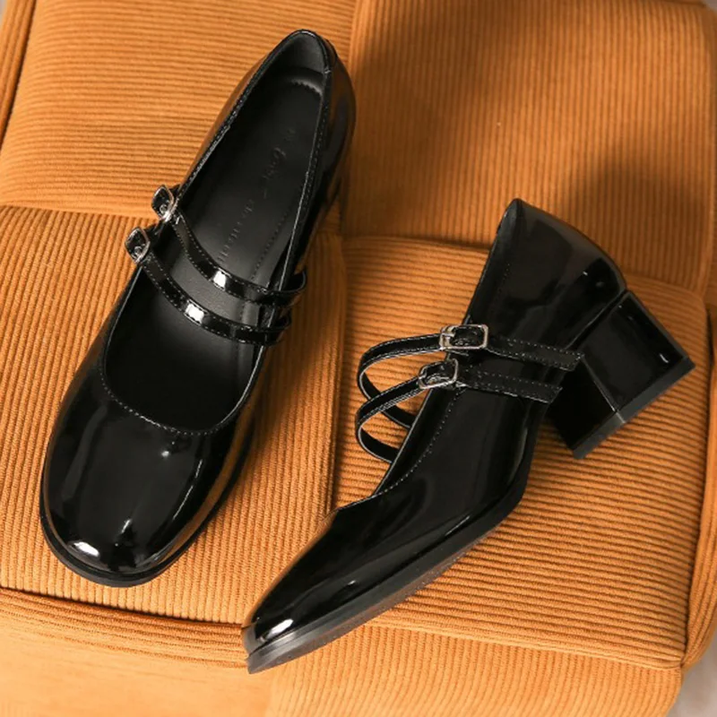 LIZAKOSHT - New Women 4.5cm High Heels Fashion Prom Pumps Female Concise Metal Buckle Strap Block Heels Lady Patent Leather Mary Jane Shoes