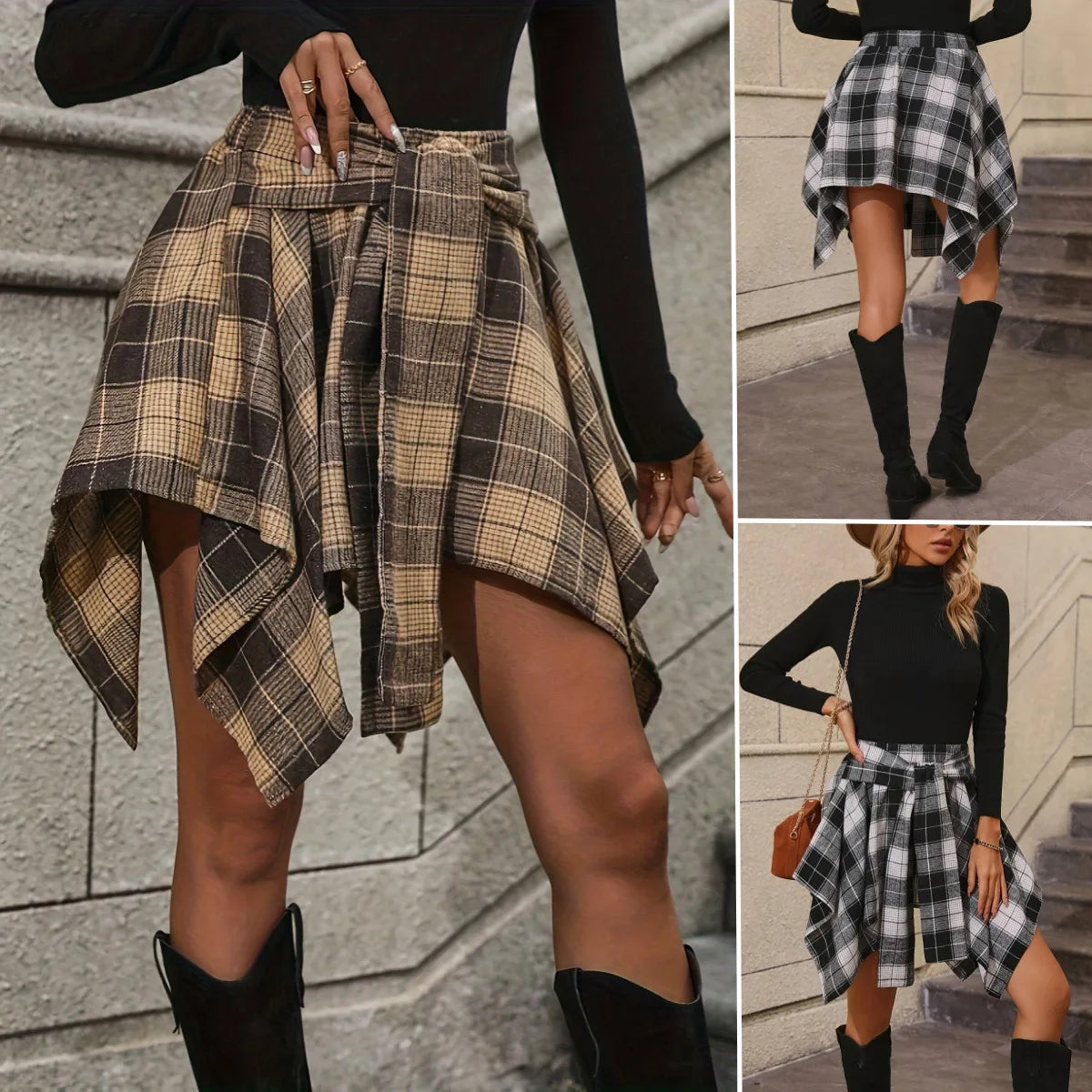 LIZAKOSHT  -  New Women's Nightclub Fashion Irregular Grid Tied Sleeves Fake Shirt Half Skirt