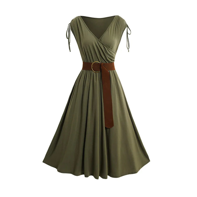 LIZAKOSHT - New Womens Summer Dress Plain Color Cinched Shoulder Surplice Plunge Belted Midi Dress A-Line Dresses vestidos para mujer