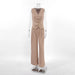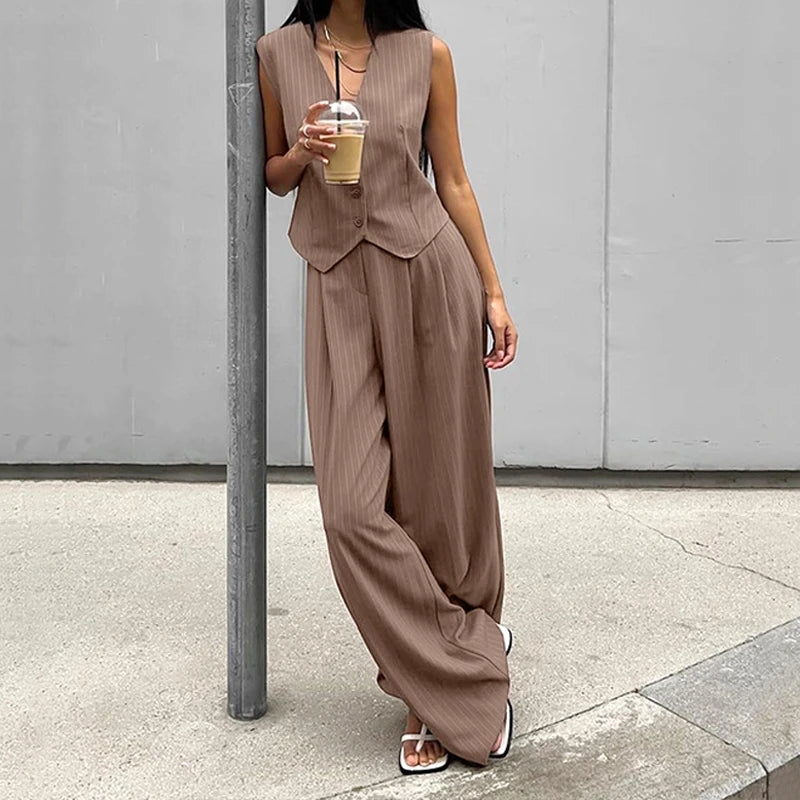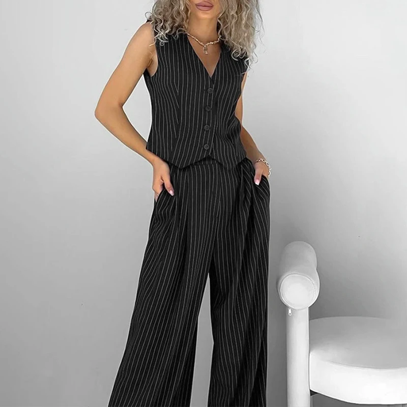 LIZAKOSHT  -  Office Lady Summer Striped Solid V Neck Buttons Sleeveless T-shirt and High Waist Wide Leg Pants Two Piece Sets For Women