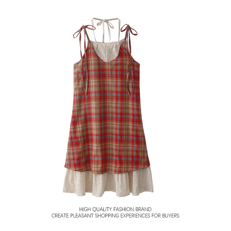 LIZAKOSHT - Original Pastoral Style Vintage Dress Embroidery Lace Splice Lace Up Fake 2pcs Slip Skirt Women Dress Plaid Long Spliced Robe