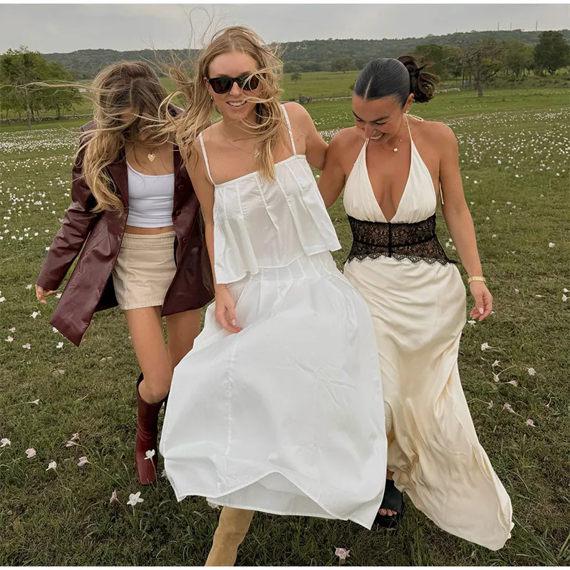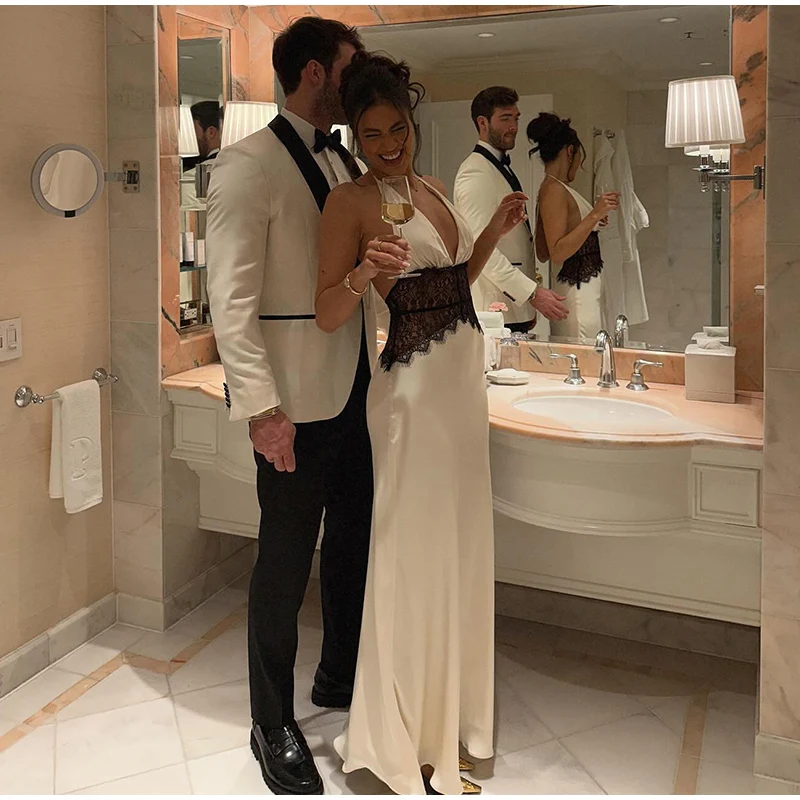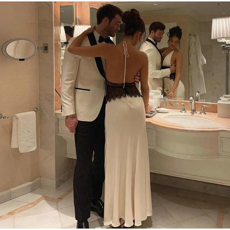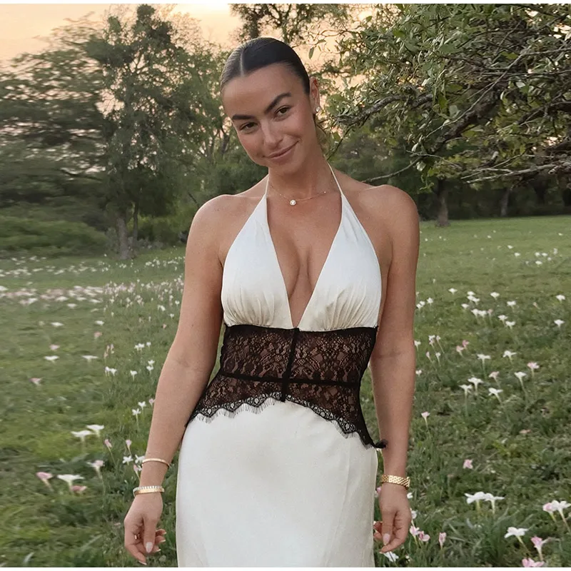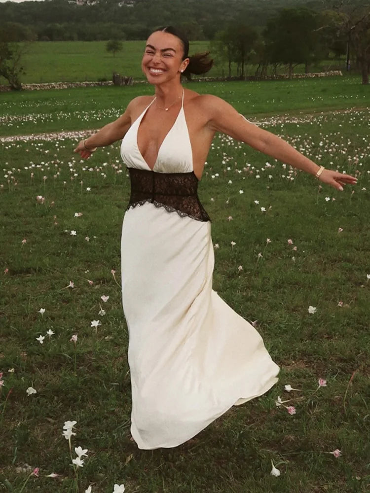 LIZAKOSHT - Patchwork Lace Long Dress For Women Deep V-neck Halter Sleeveless Draped Backless Robe 2025 Summer Elegant Female Party Dresses