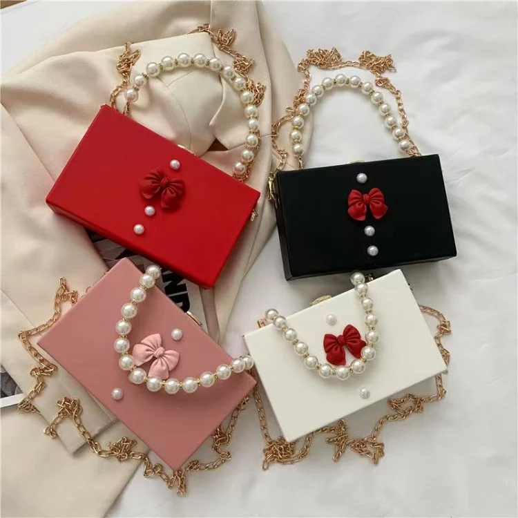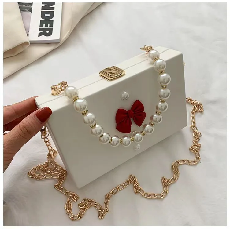 LIZAKOSHT - Pearl Bow Small Square Bag Women's Beaded Box Bag Female Handbag Crossbody Bag Mobile Phone Shoulder Bag