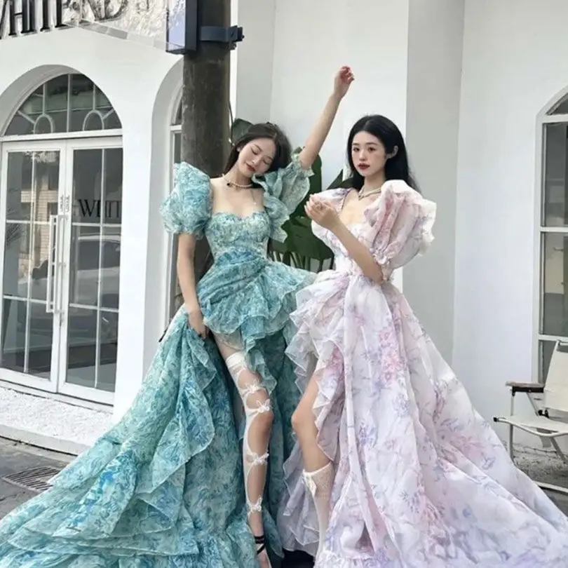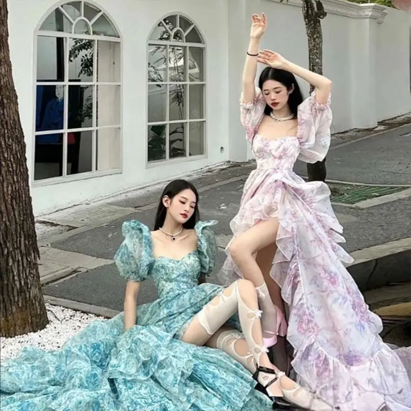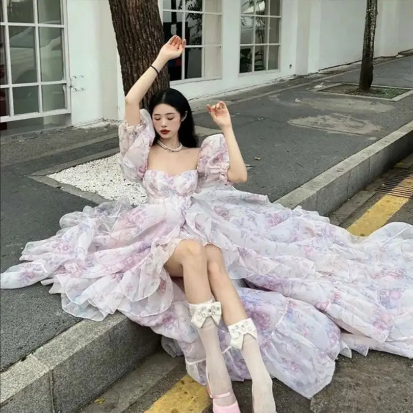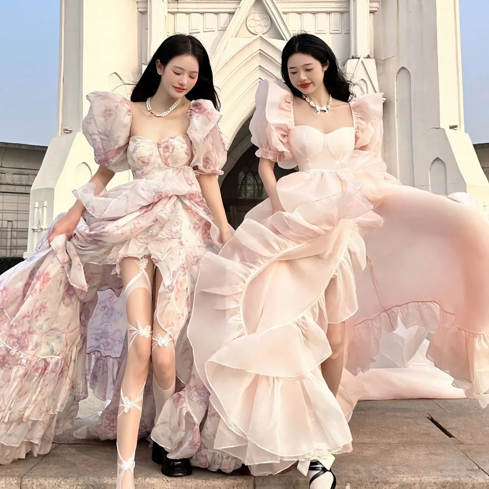 LIZAKOSHT - Pink Princess Dress Women Elegant Square Collar Puff Sleeve Mesh Party Dress High Waist Birthday Party Dress Fashion Prom Dress