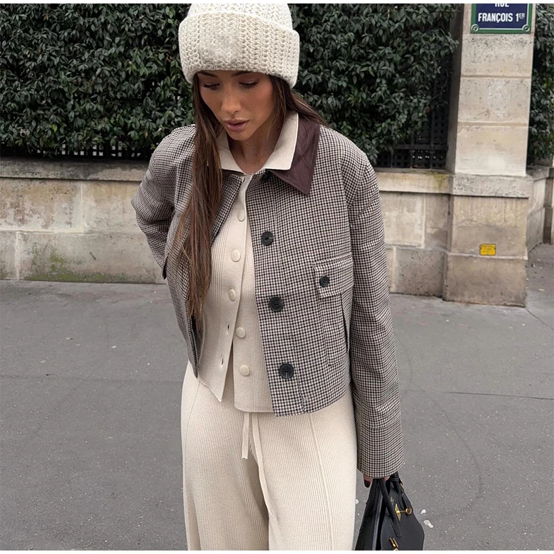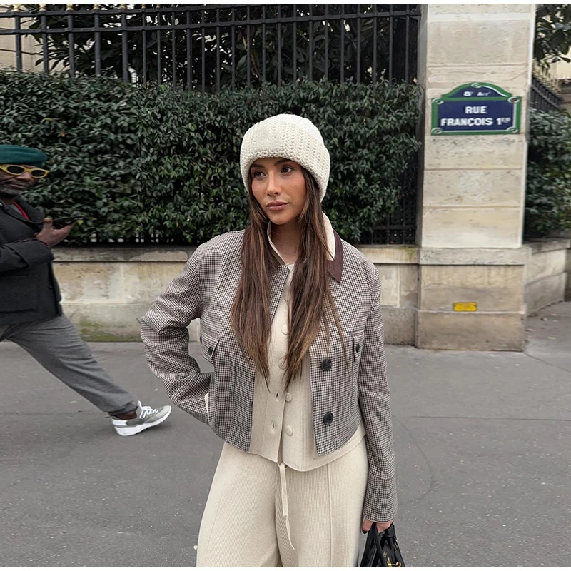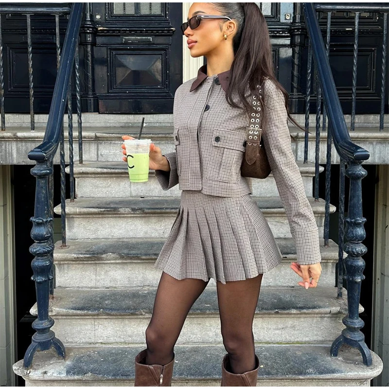 LIZAKOSHT - Plaid Short Jacket Pleated Skirt Set Women Chic Street Patchwork Collar Jackets Straight Pant 3 Piece Sets Lady Spring Outfit