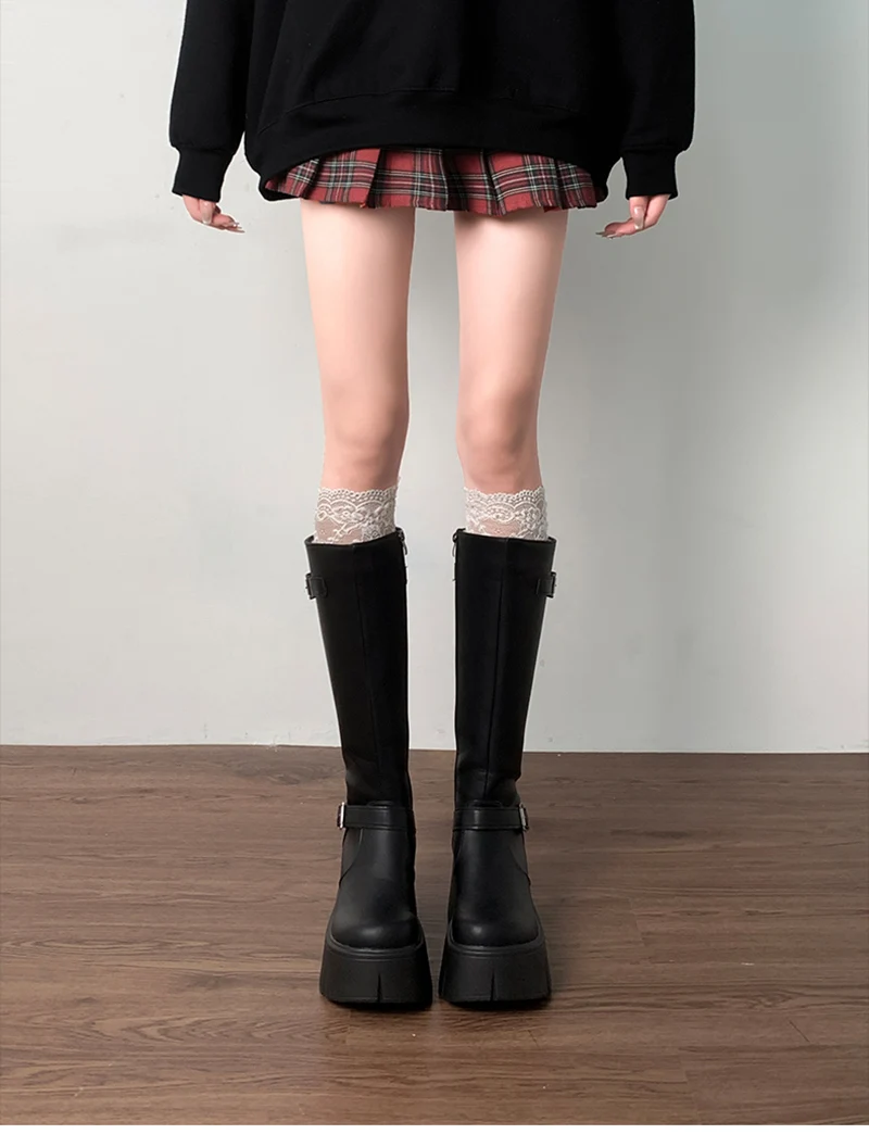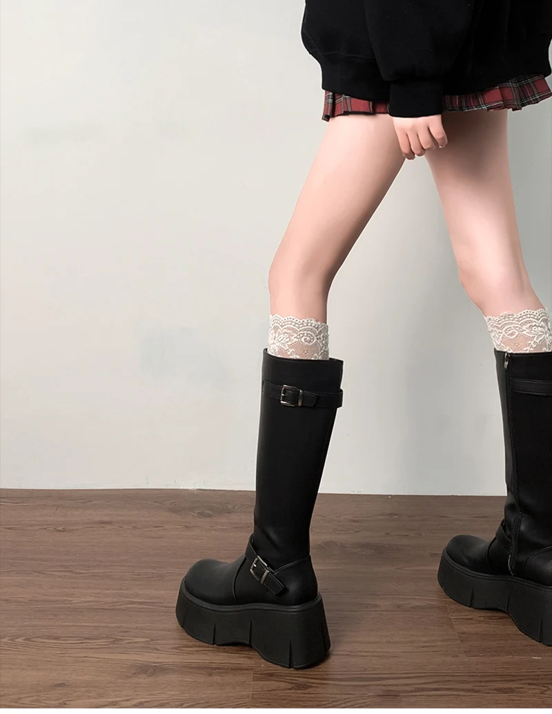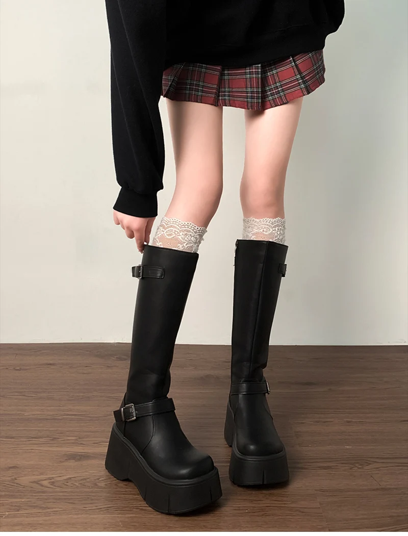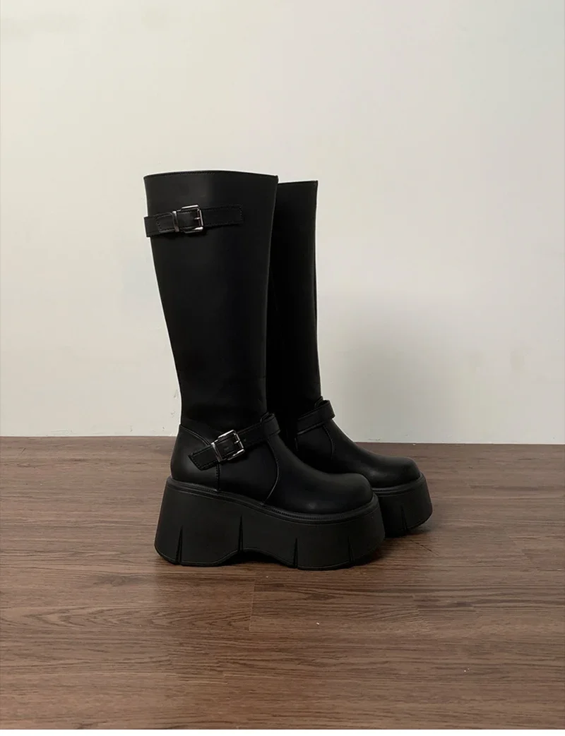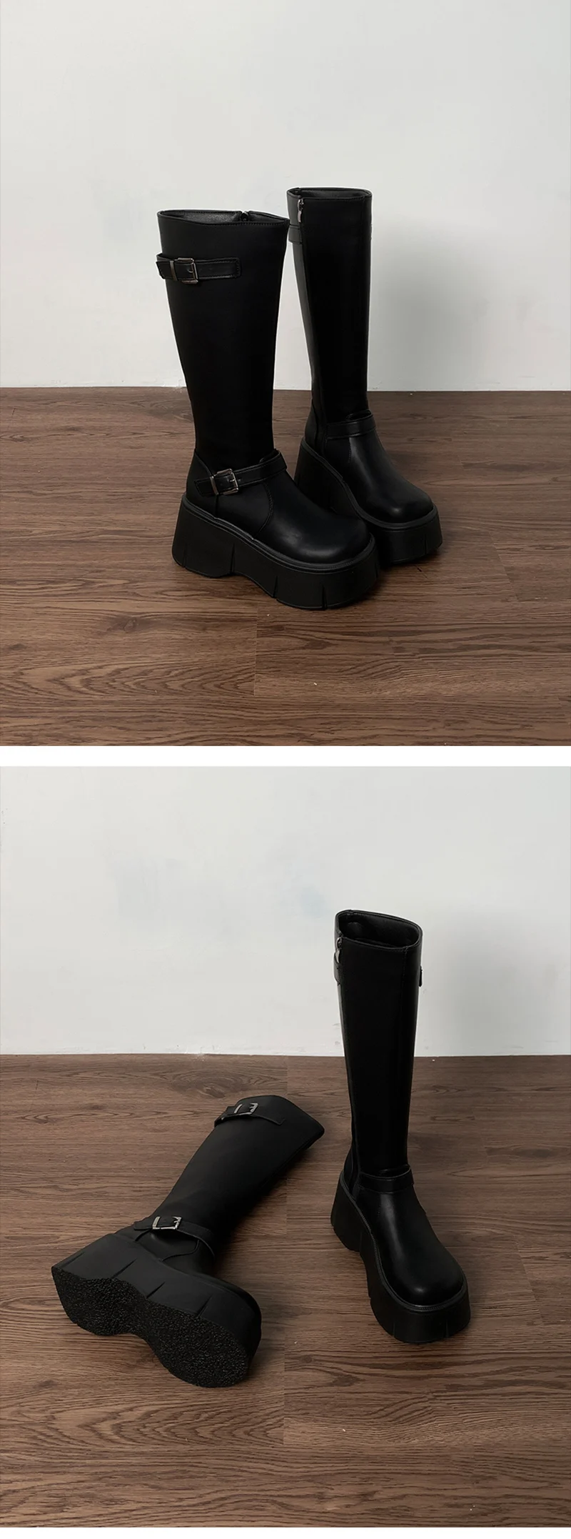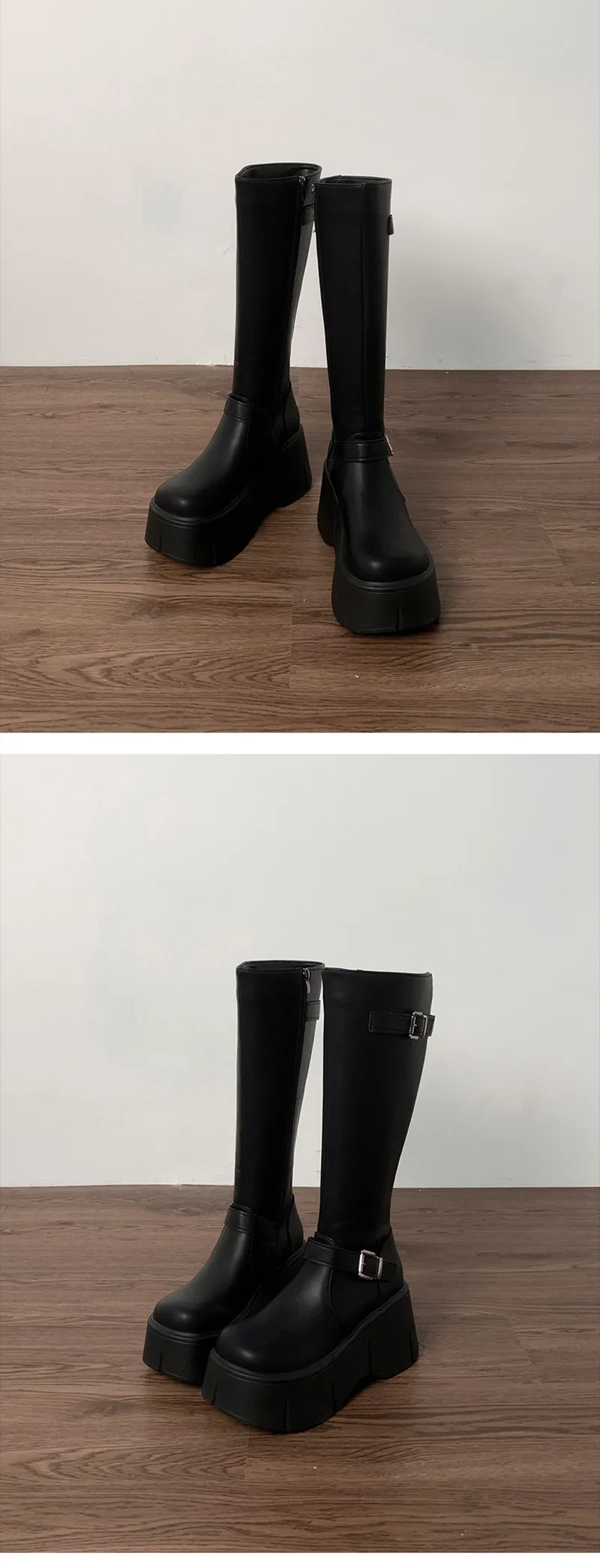 LIZAKOSHT - Platform Wedges Heel Women High Boots Fashion Belt Buckle Slim Long Booties Autumn Winter Women's Knight Botas Altas