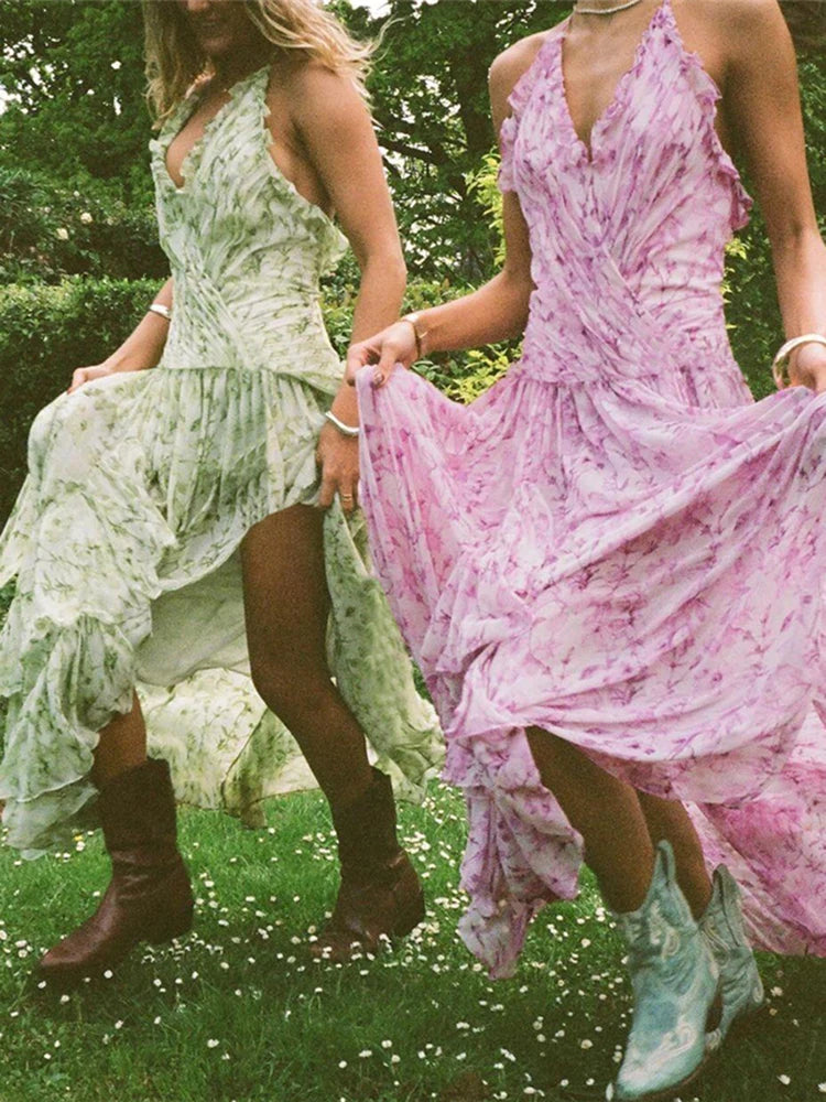 LIZAKOSHT - Pleated Trim Dresses Women Hipster Popular Halter V-neck Stacked Irregular Maxi Bodycon Mujer Elegant High Street Frock