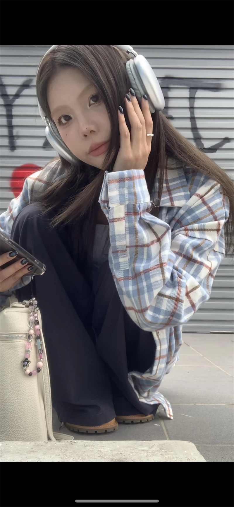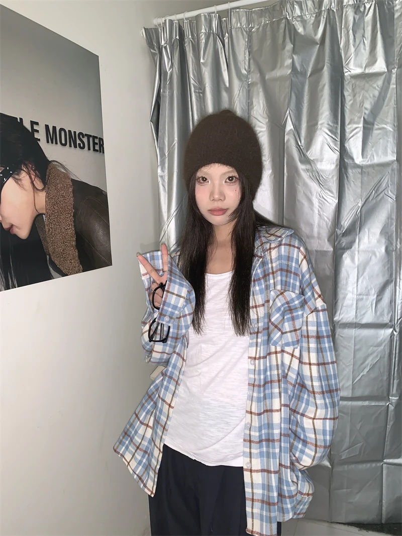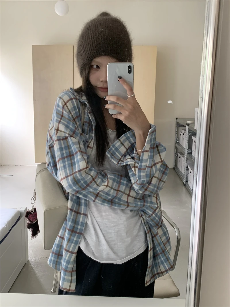 LIZAKOSHT - Polo Collar Single-breasted Loose Casual Long Sleeve Shirt Women 2024 Autumn New High Street Contrast Color Plaid All Match Tops