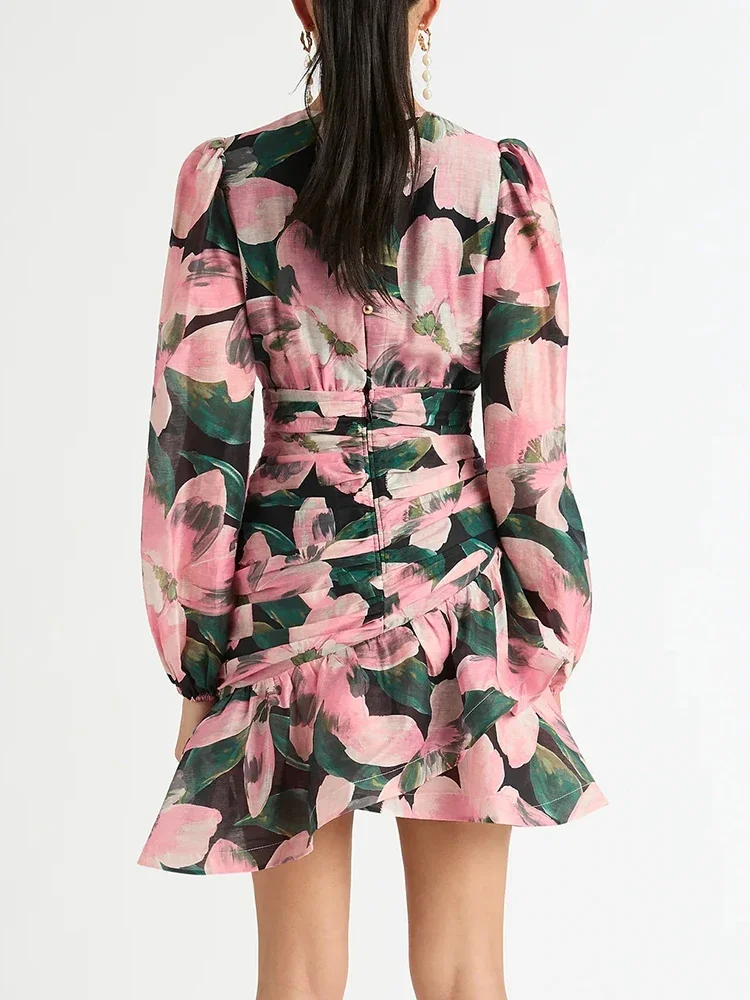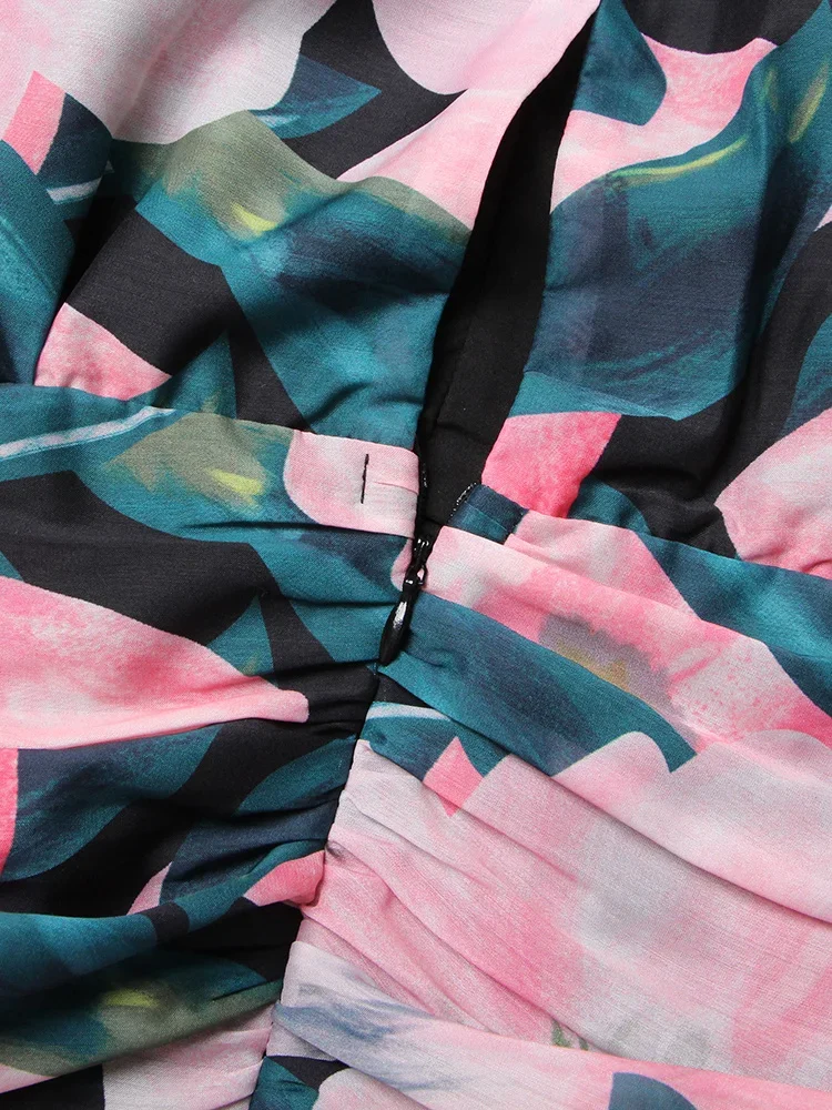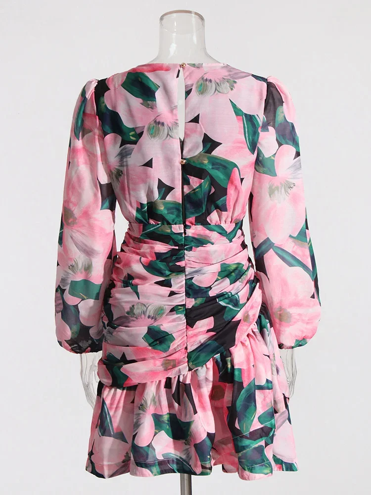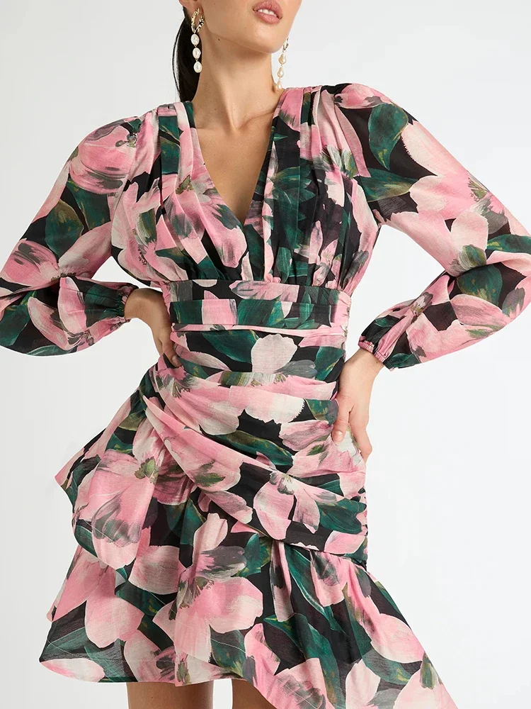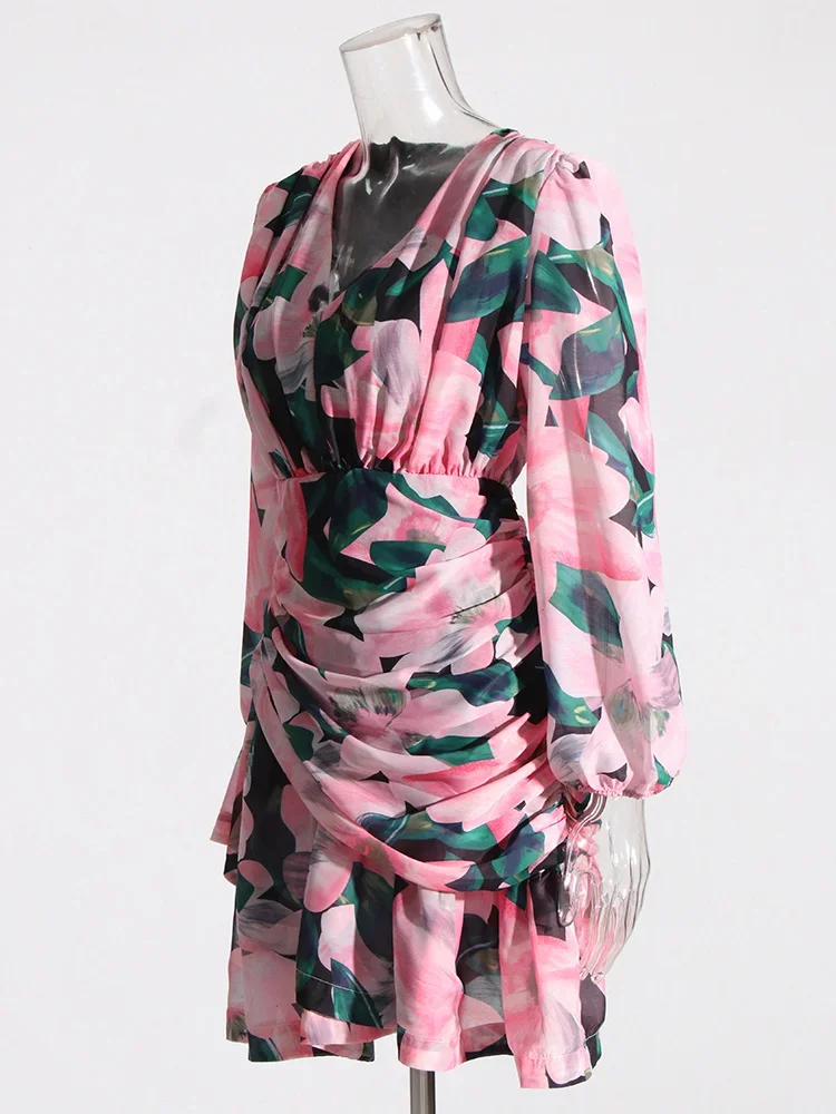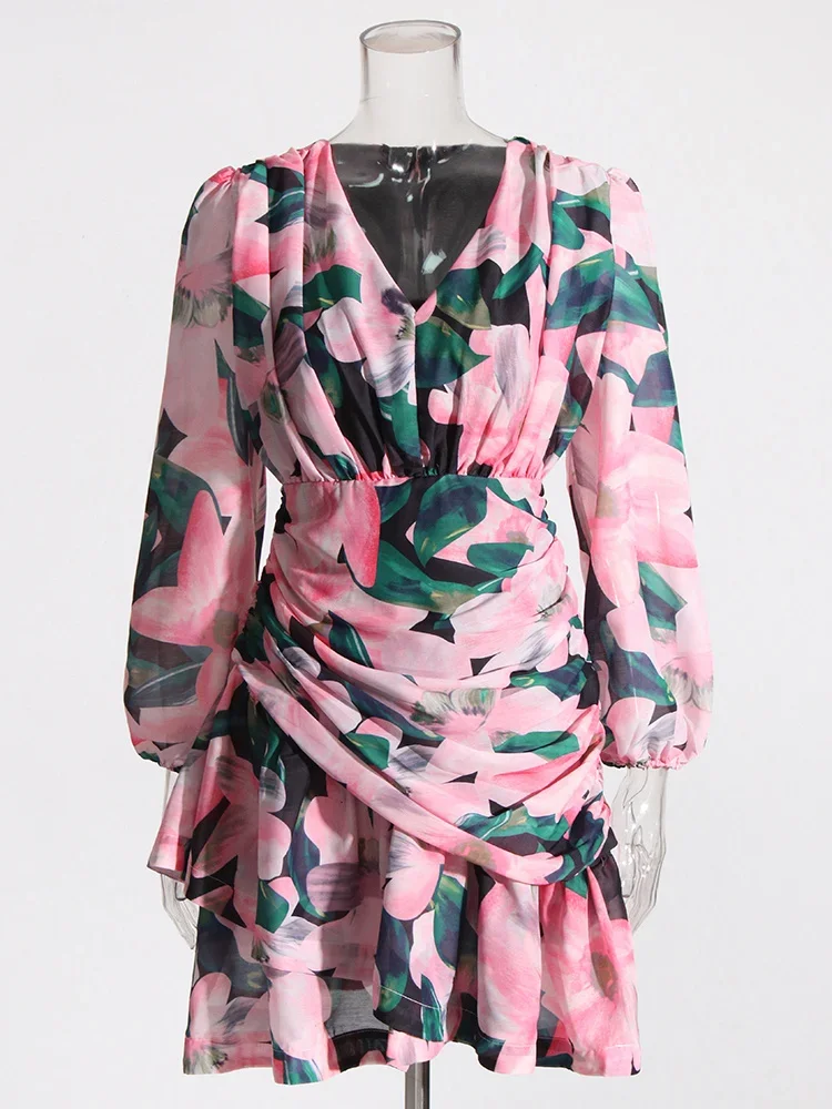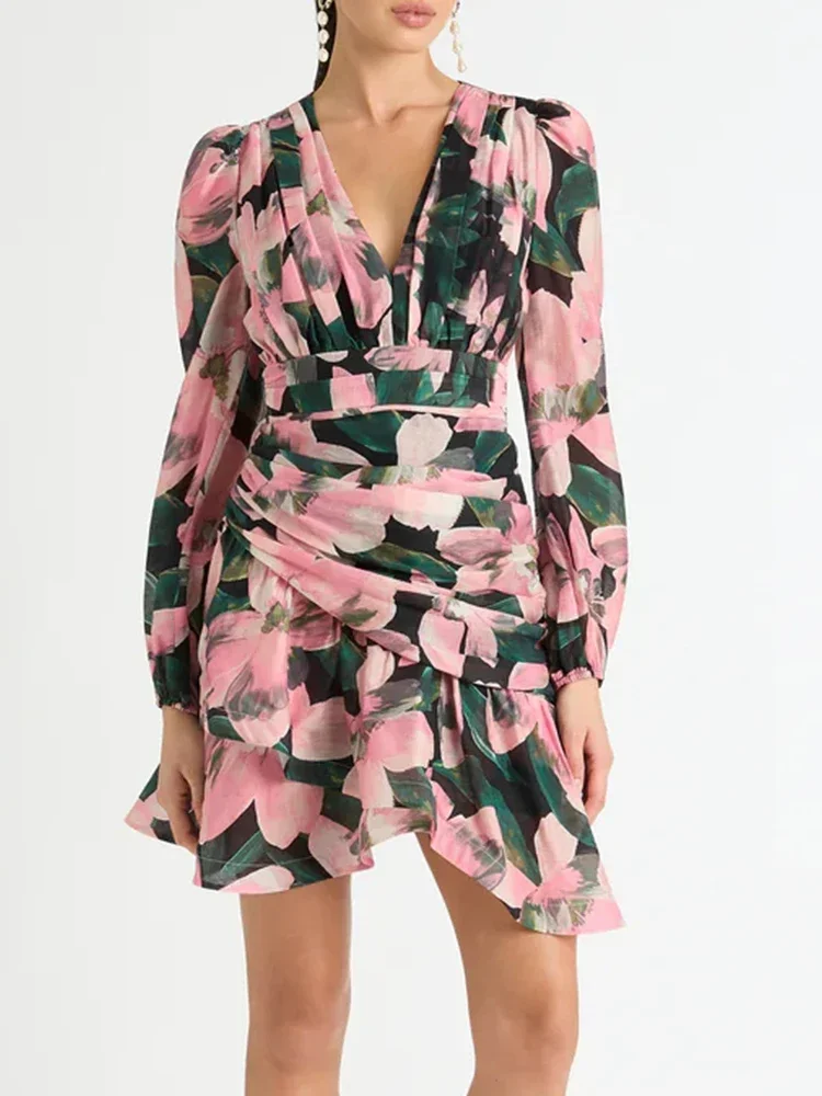 LIZAKOSHT - Print Irregular Dresses For Women V Neck Lantern Sleeve High Waist A Line Ruched Mesh Tunic Mini Dress Female Fashion New