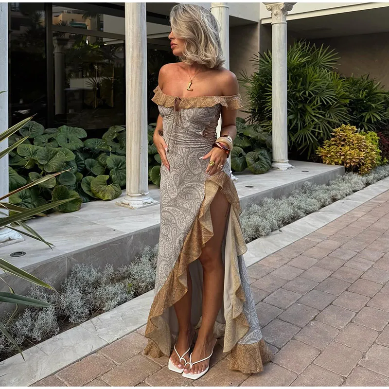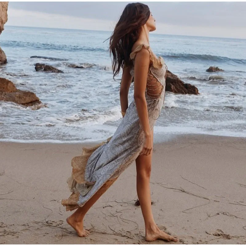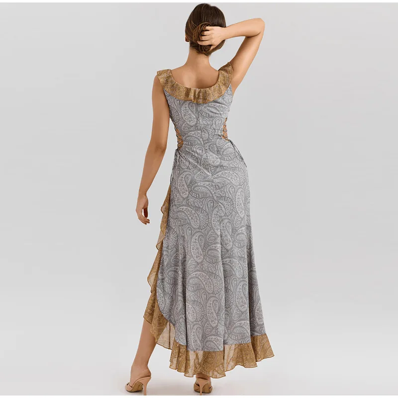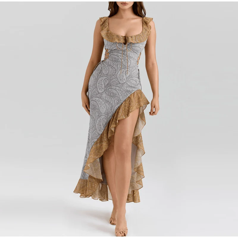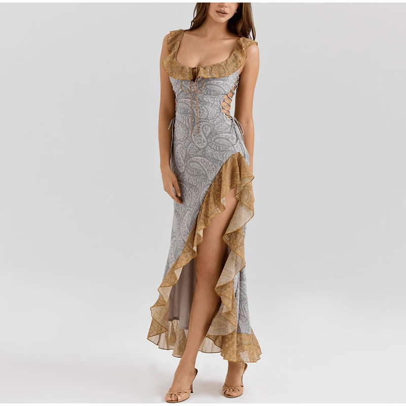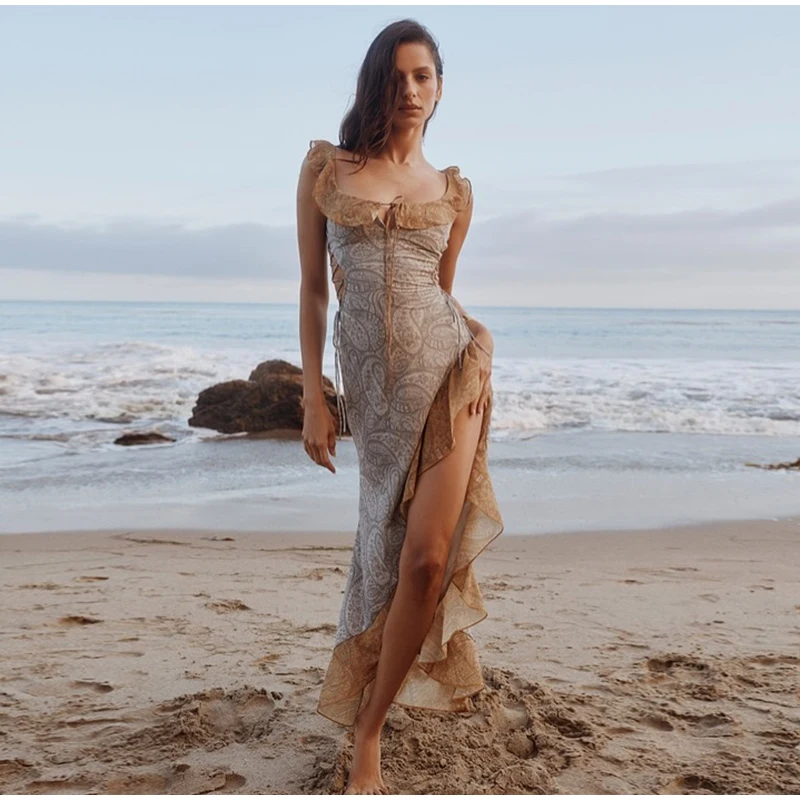 LIZAKOSHT - Printed Flounce Lace Up Long Halter Dress Woman Slim Sleeveless Patchwork Color Chic Robes Sexy Beach Vacation Women's Dresses