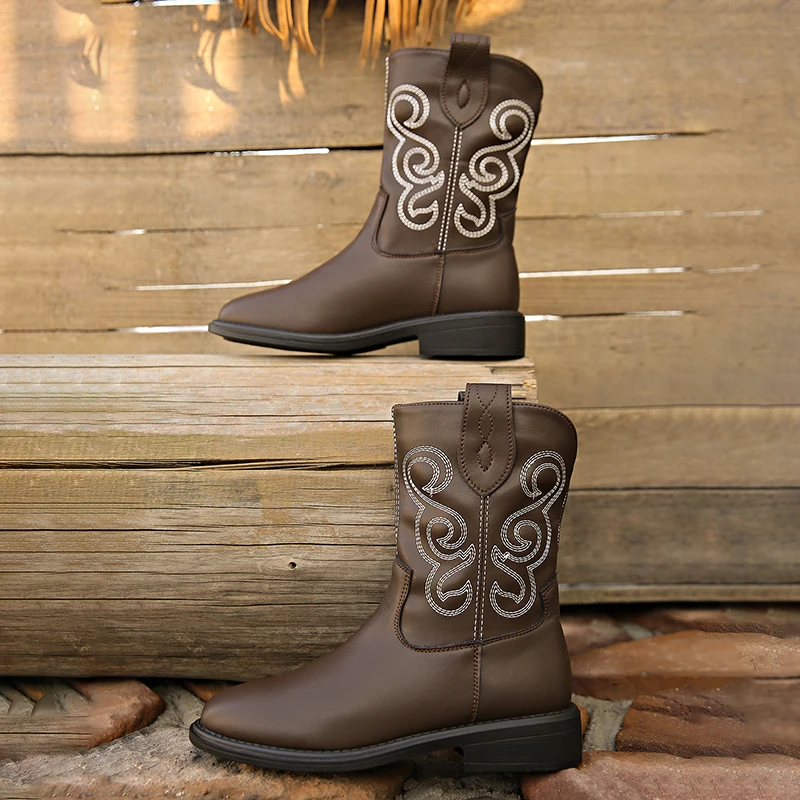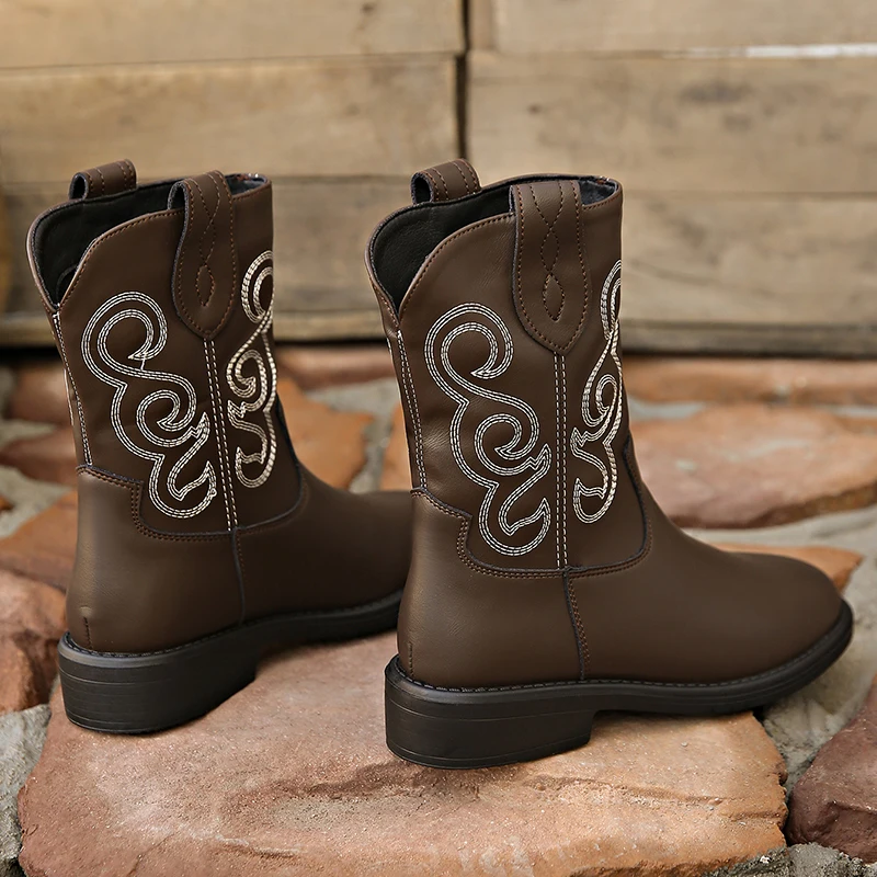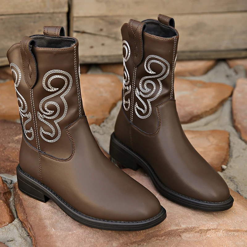 LIZAKOSHT - Pu Leather Retro Western Boots Women Autumn Platform Low Heels Chelsea Ankle Boots Woman Embroider Slip On Cowboy Booties
