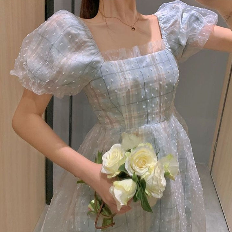Lizakosht Puff Sleeve Vintage Plaid Dress Women Lace Princess Dress for Women Square Collar Evening Party Midi One Piece Dress Summer