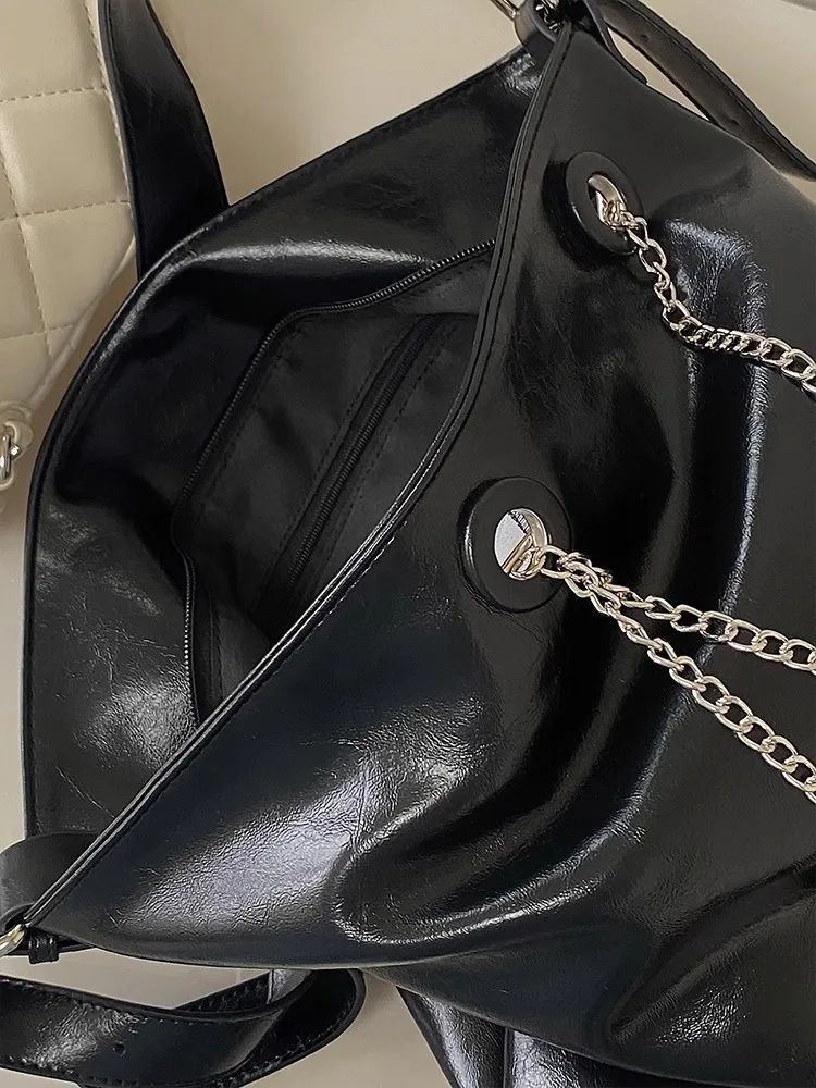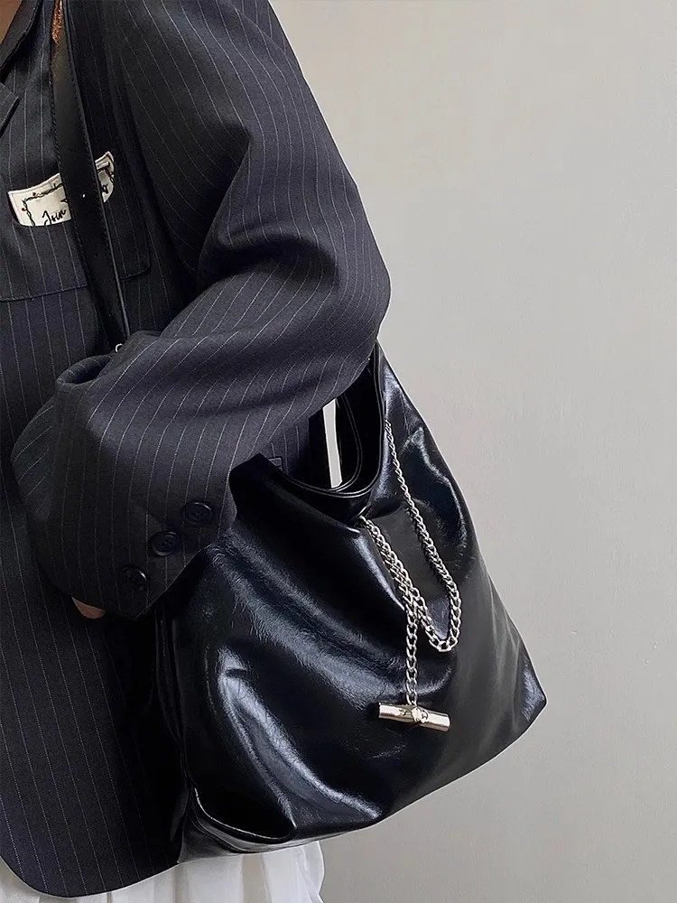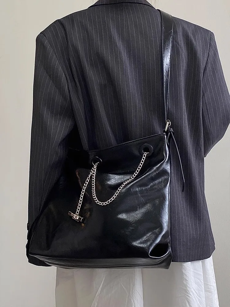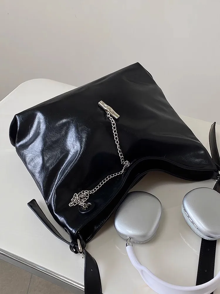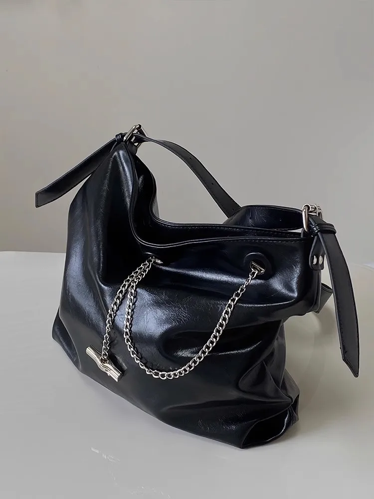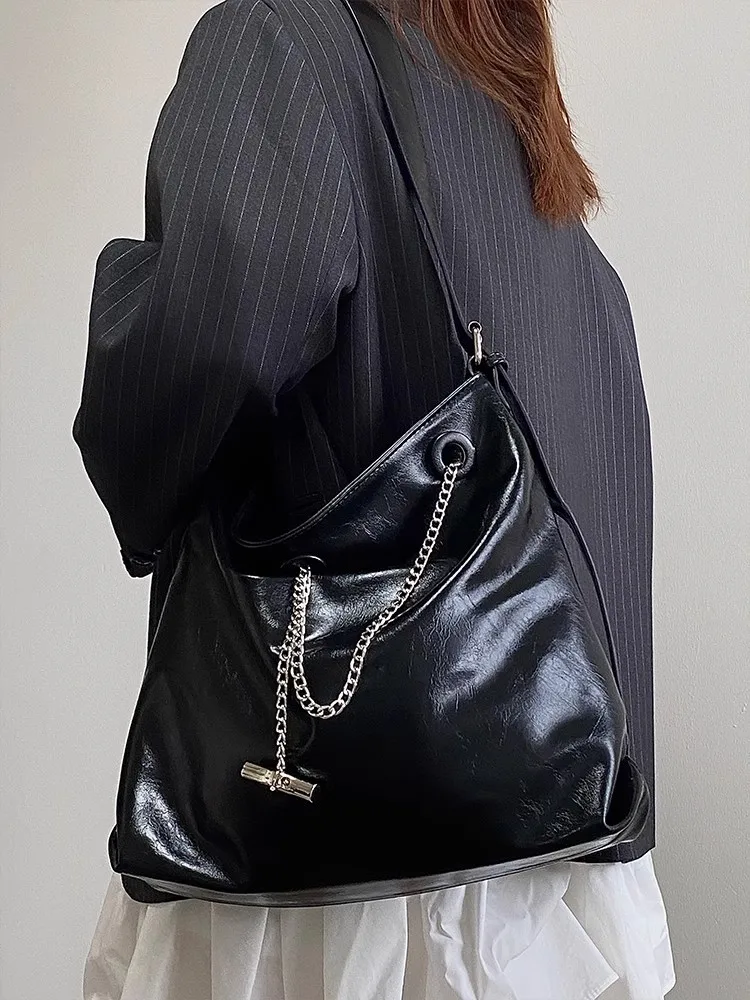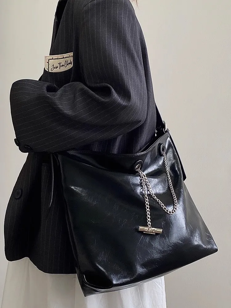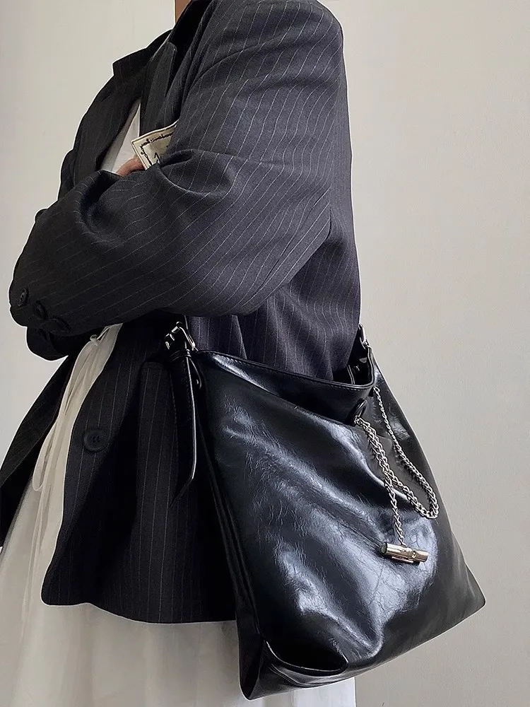 LIZAKOSHT - Pure Black Womens Shoulder Bag Chains Y2k Gothic Fashion Large Capacity Tote Bag Pu Leather Casual Advanced Ladies Handbag