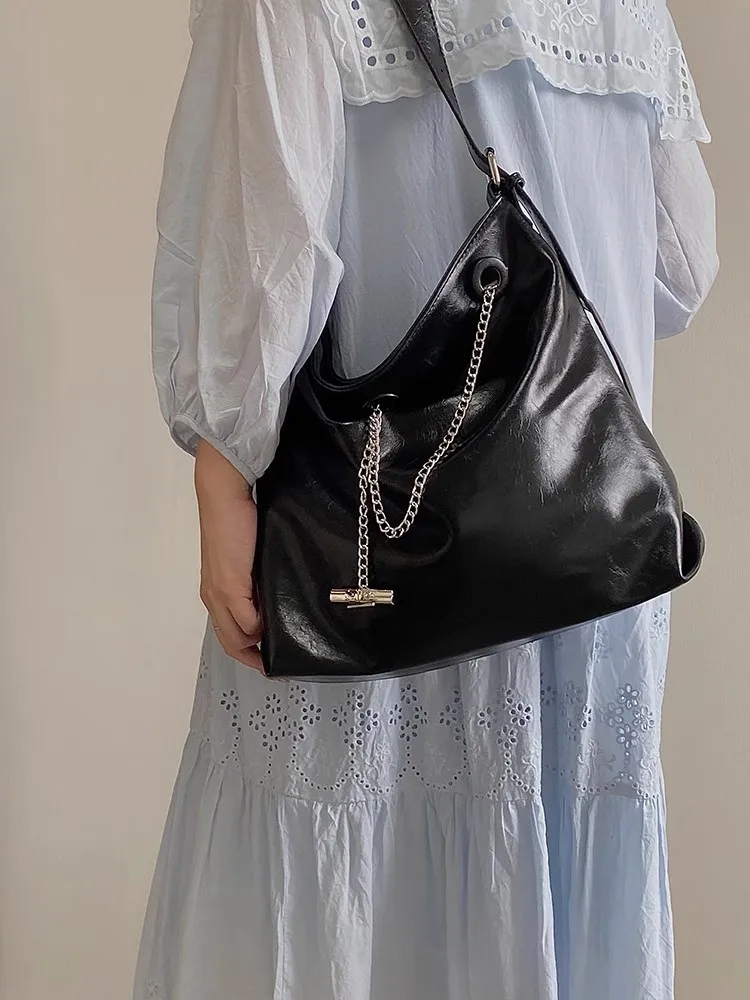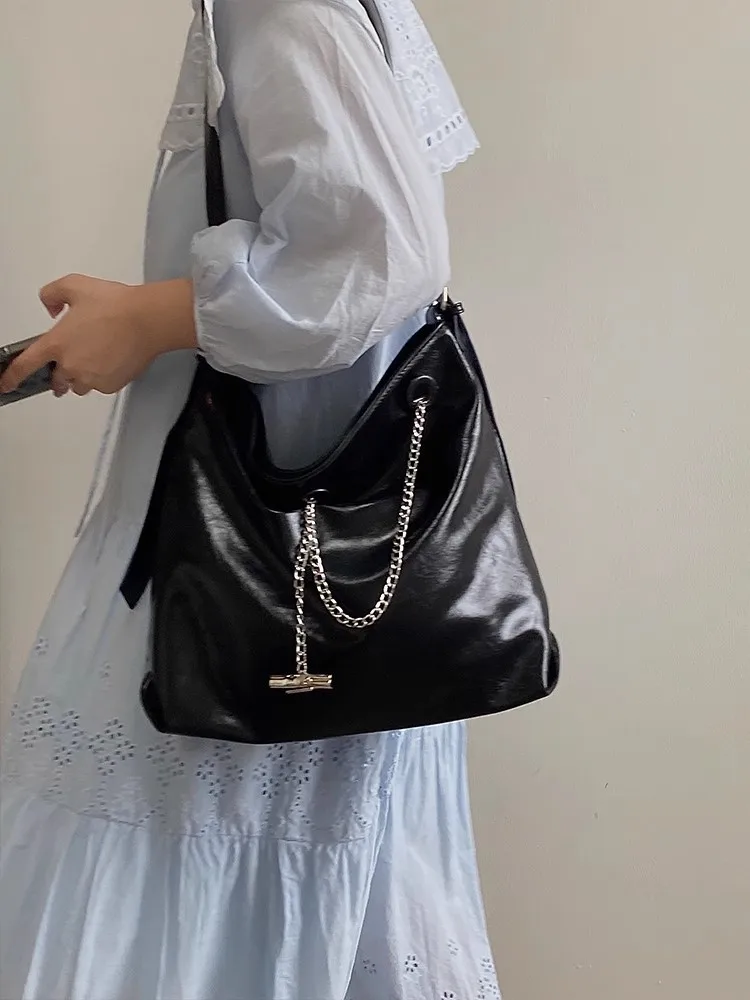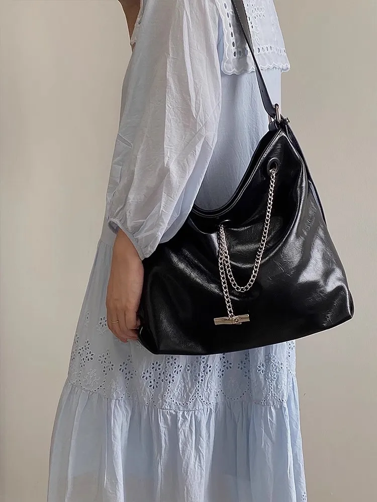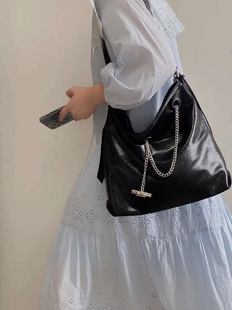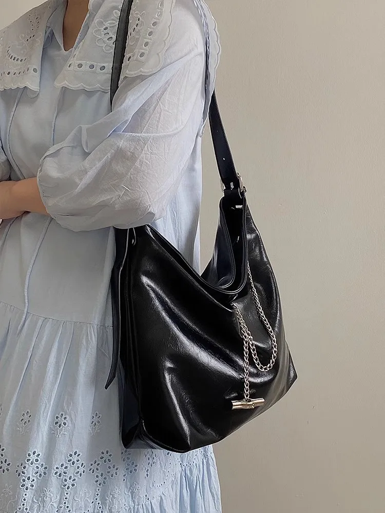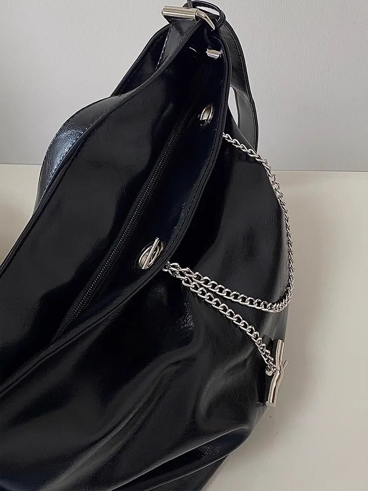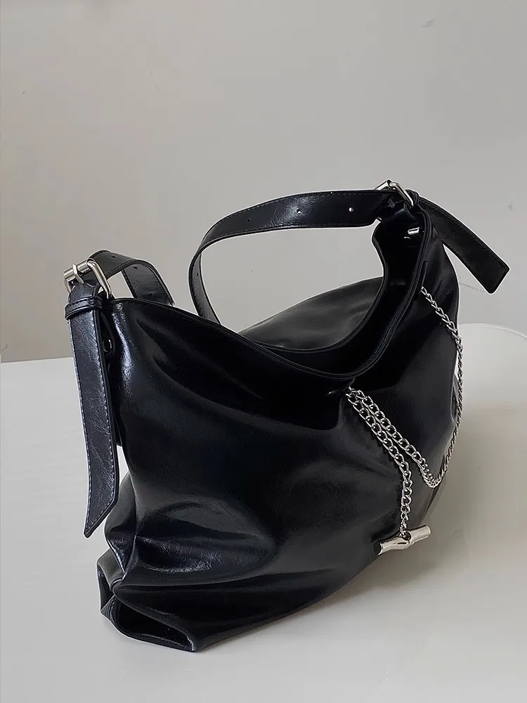 LIZAKOSHT - Pure Black Womens Shoulder Bag Chains Y2k Gothic Fashion Large Capacity Tote Bag Pu Leather Casual Advanced Ladies Handbag