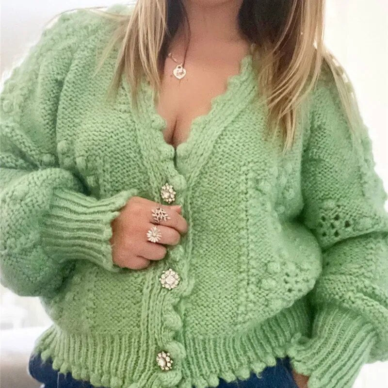 Lizakosht Pure Green Cardigan Button Polka Dot Hollow Texture Knitted Sweater Coat Winter Fashion Ladies Cardigan Top Women's Clothing