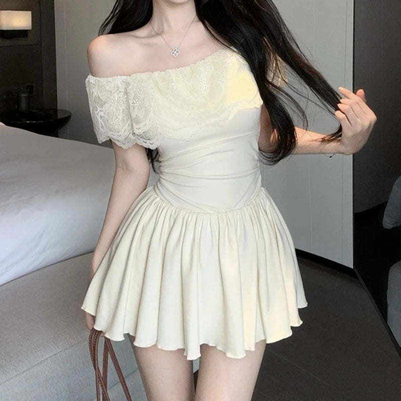 LIZAKOSHT  -  Pure Lustrous Ruffled Off-shoulder Lace Spliced pleated Waist-hugging Design Sweet Princess Dress
