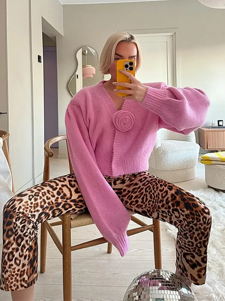 Lizakosht Purple Solid V Neck 3d Flower Knit Cardigan Fo Women Chic Casual Long Sleeve Cropped Jumper Sweater 2024 Spring Street Knitwear