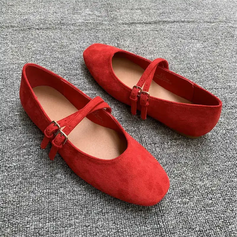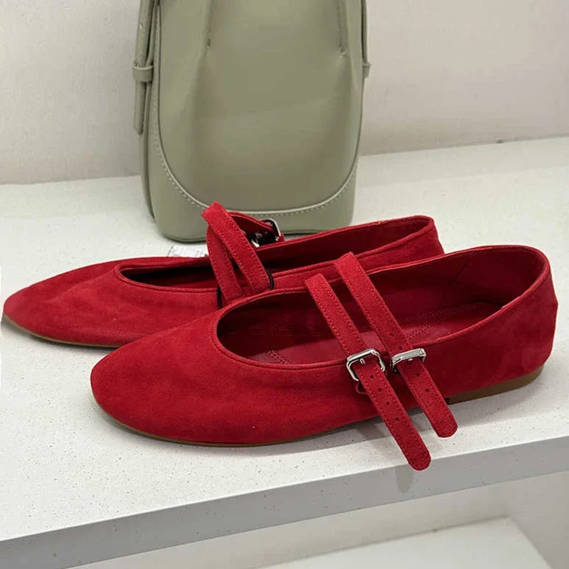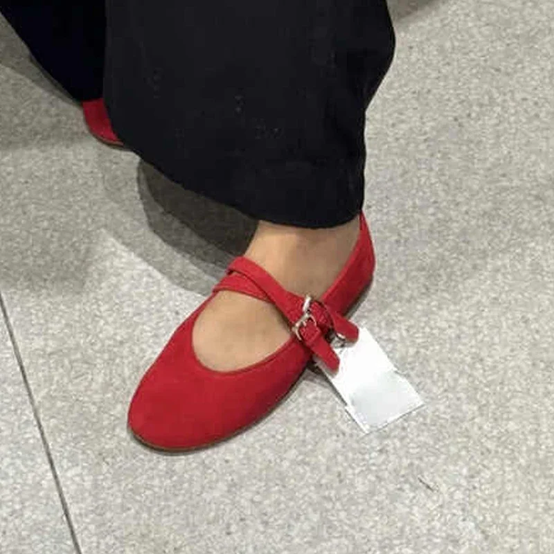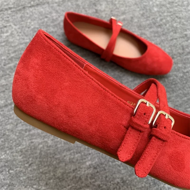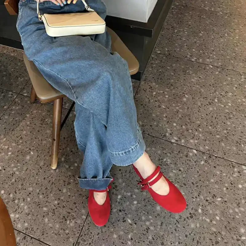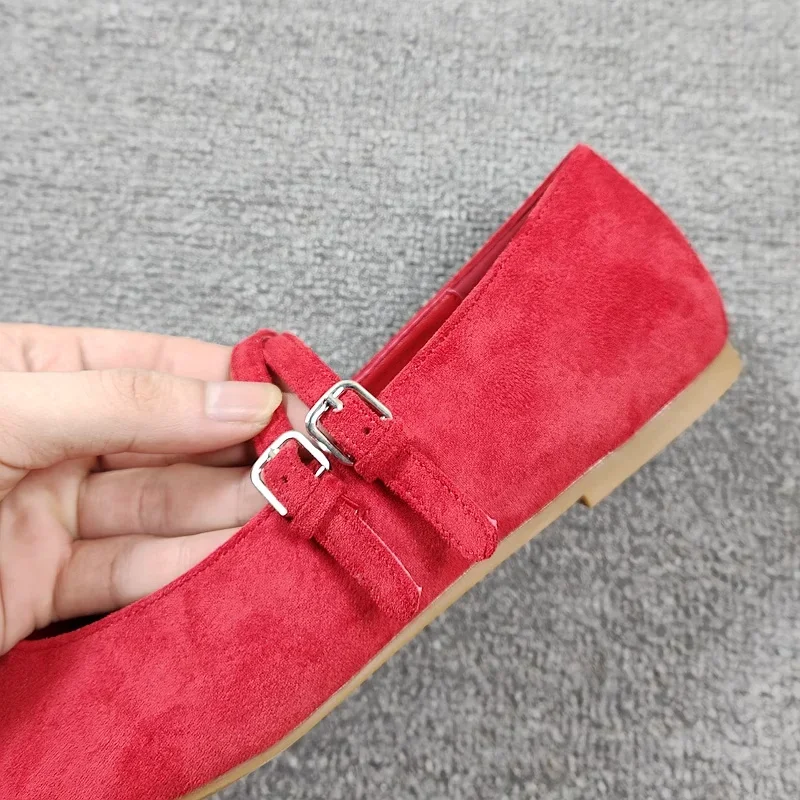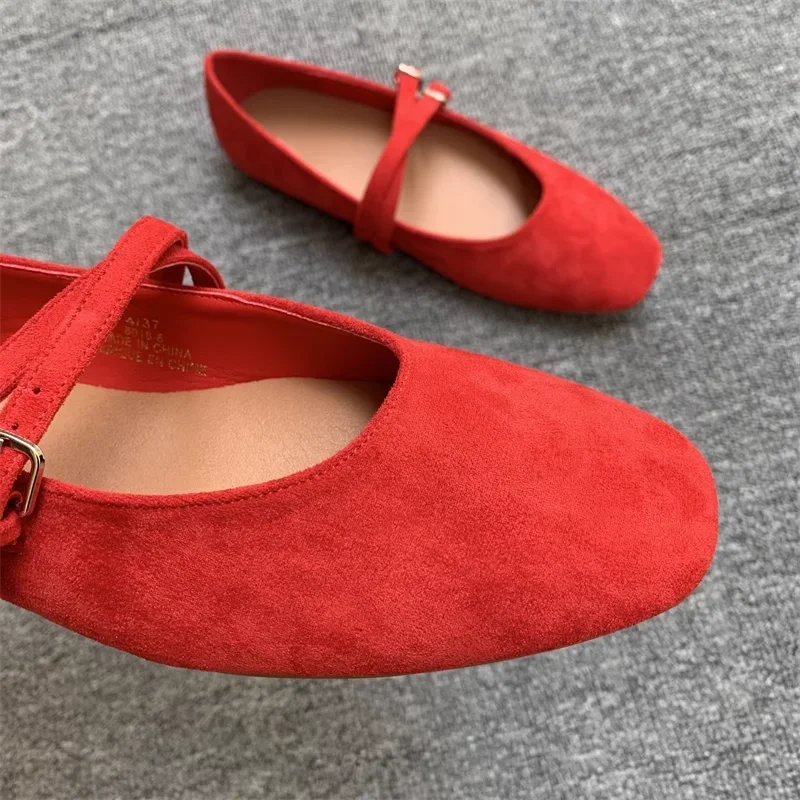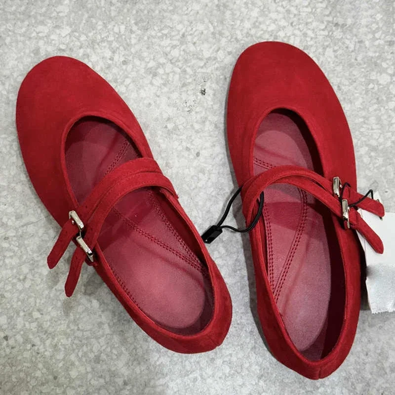 LIZAKOSHT - Red Velvet Upper Round Head Flat Shoes Women Metal Buckle Shallow Mouth Sandals New Leisure Countryside Fashion for Woman