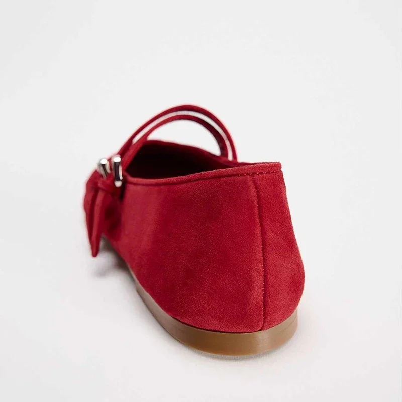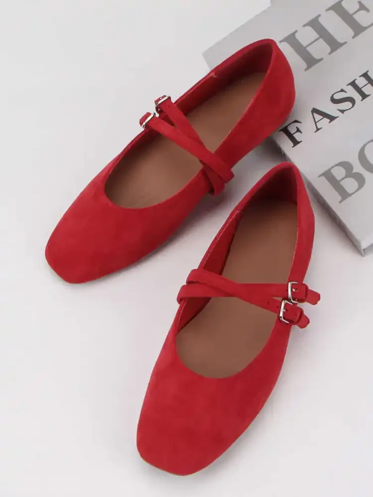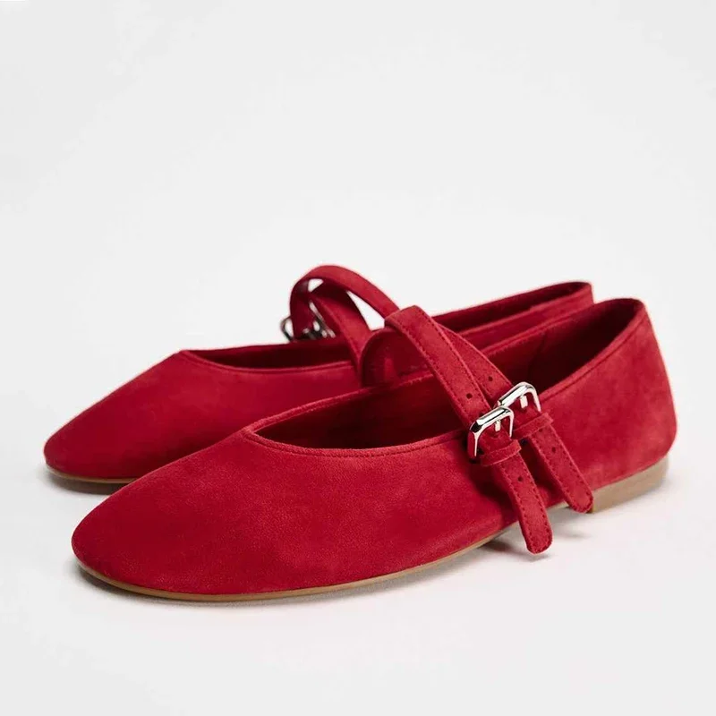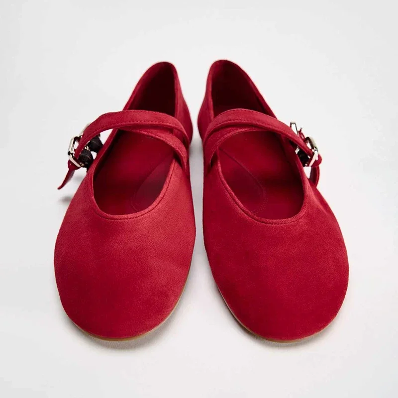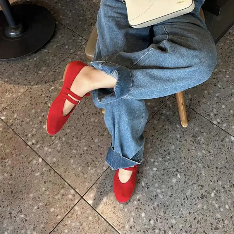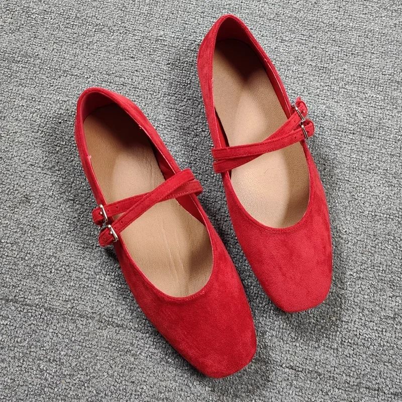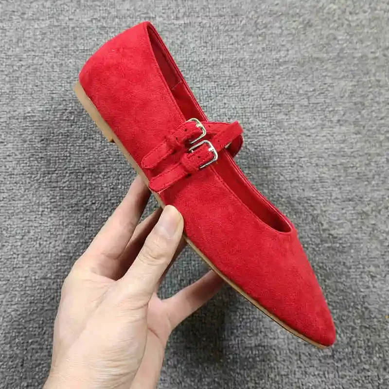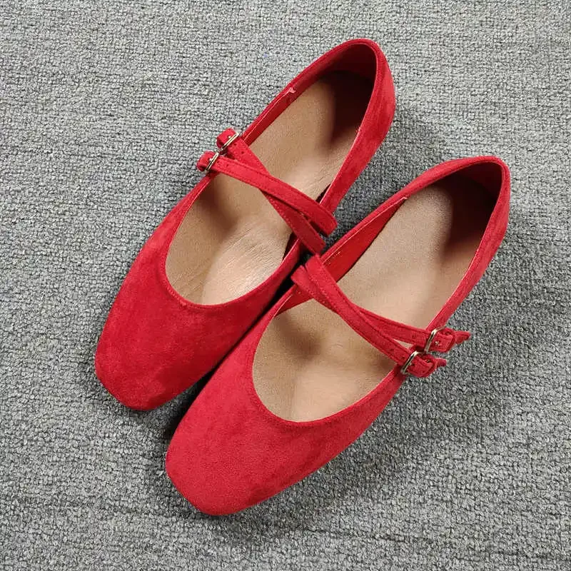 LIZAKOSHT - Red Velvet Upper Round Head Flat Shoes Women Metal Buckle Shallow Mouth Sandals New Leisure Countryside Fashion for Woman