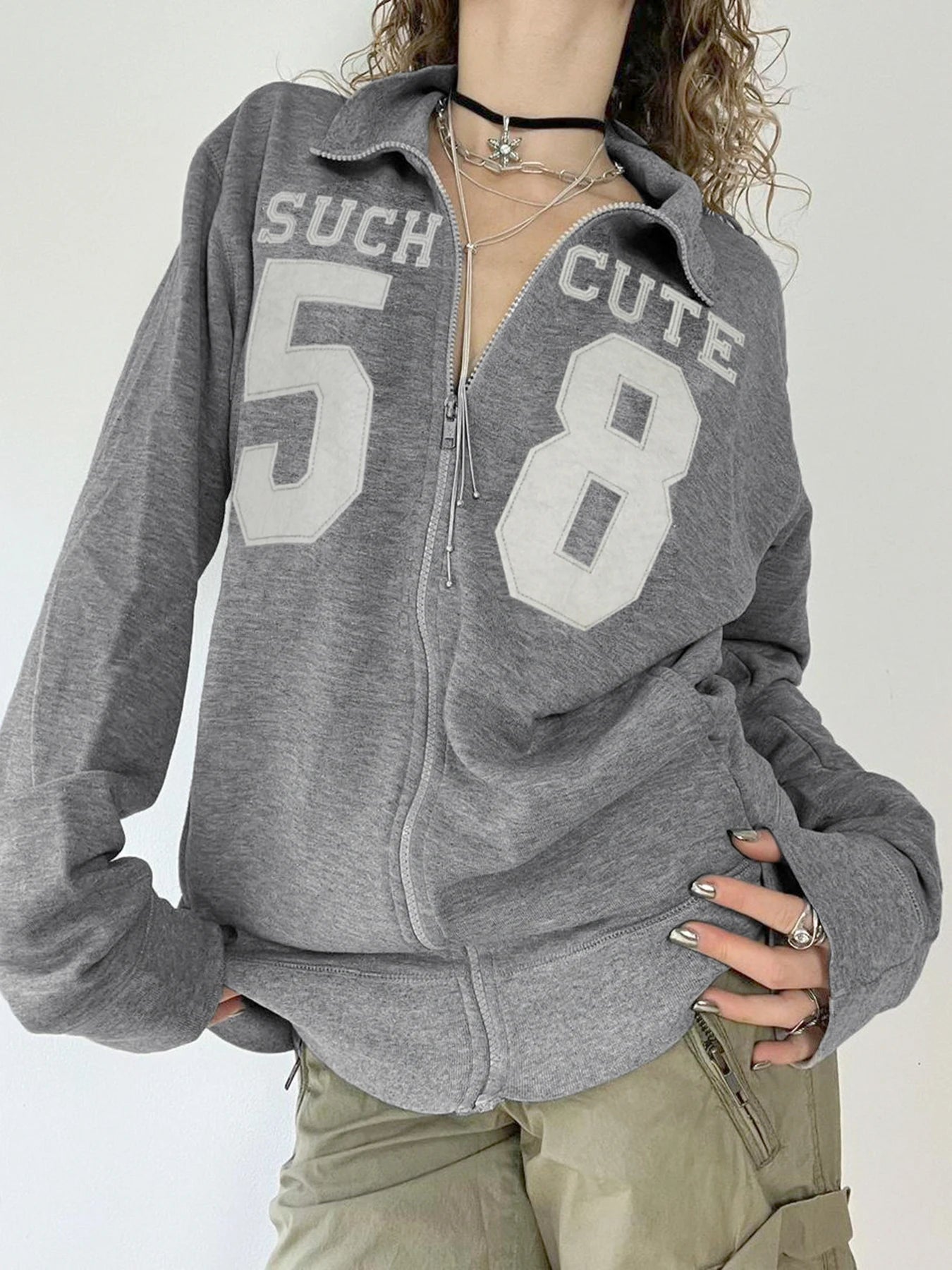 LIZAKOSHT - Retro Gray Digital Print Zipper Sweatshirts Harajuku Turn-down Collar Coats Casual Outerwear Autumn Tops Women's Jacket