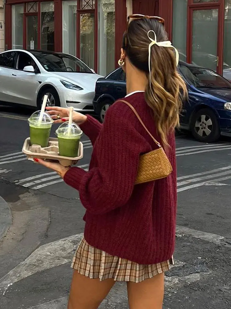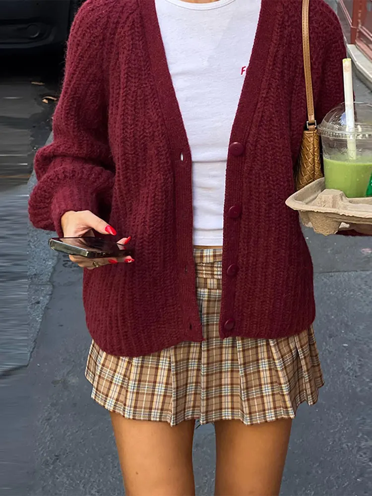 LIZAKOSHT Retro Solid V-neck Knit Thick Warm Cardigan Lanter Sleeve Women Single Breasted Loose Female Sweater Autumn Chic Casual Outwear