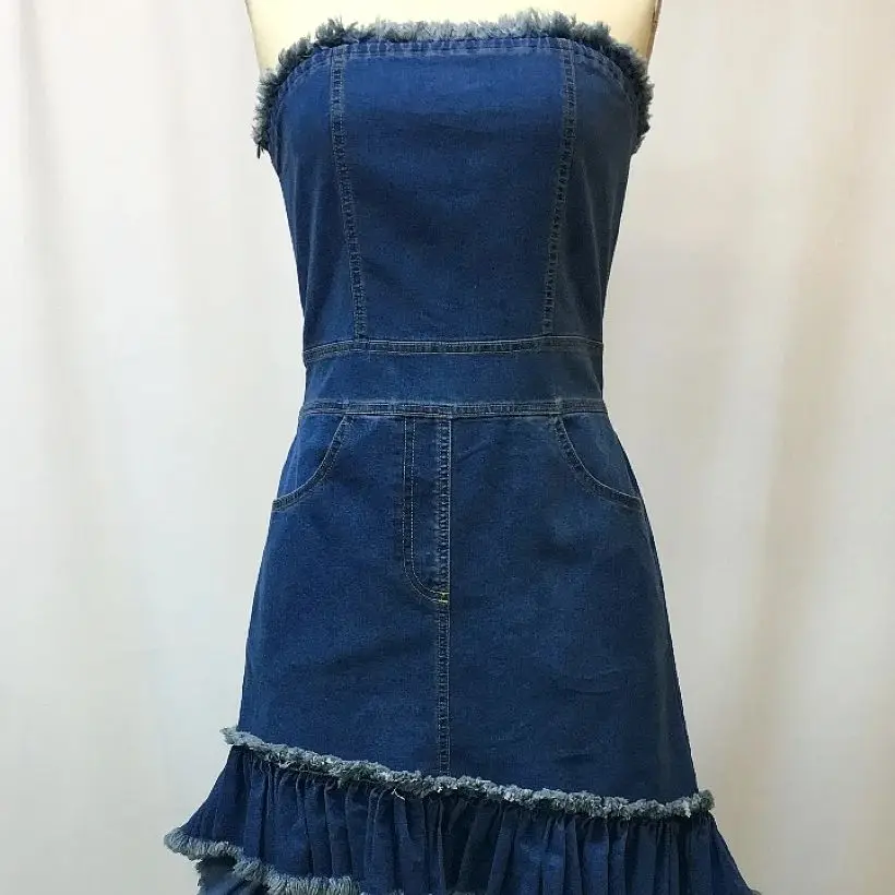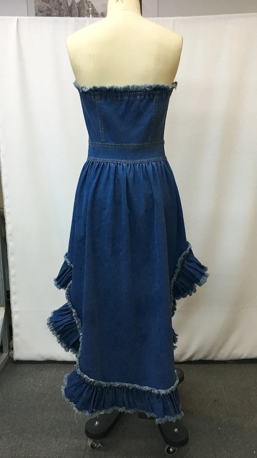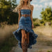 LIZAKOSHT  -  Retro Tube Top Dress Short Front Long Back Ruffle Hem Midi Length Bohemian Style Wedding Guest Party Beach Maxi Dress