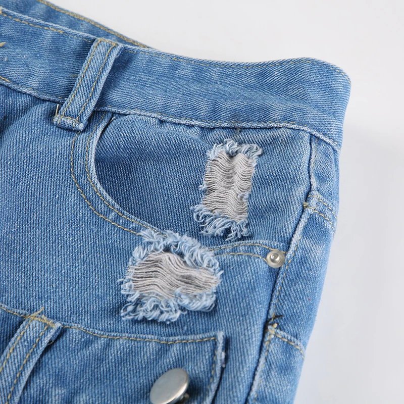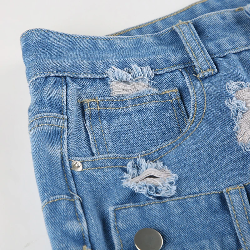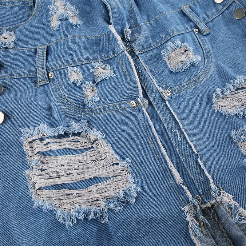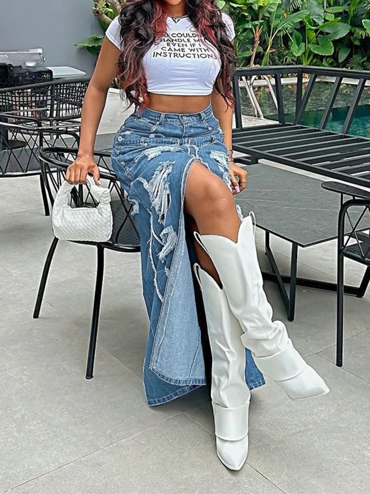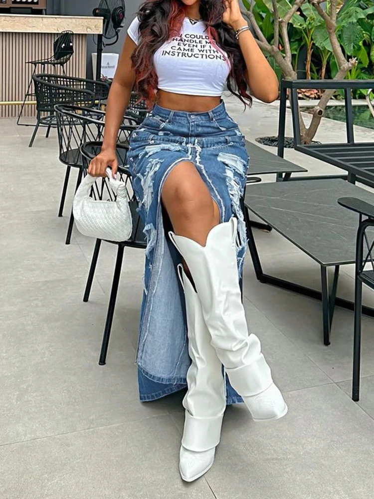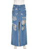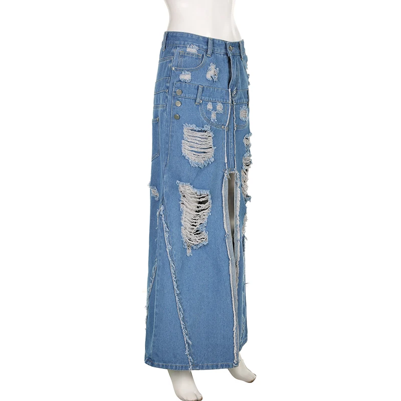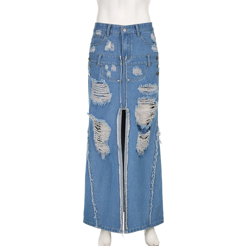 LIZAKOSHT - Ripped Denim Long Skirt American Vintage Women Loose High Waist Straight Split Maxi Skirts Fashion femme Streetwear