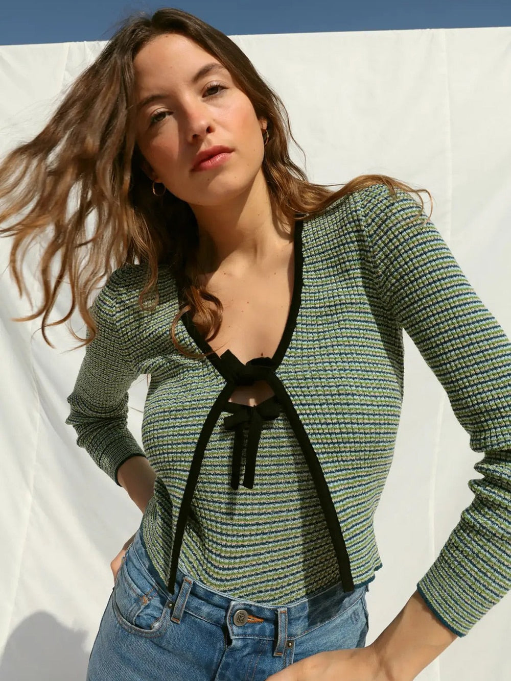 Lizakosht Rowling Mirror Striped Belt Knit Women Cardigan V-neck Long Sleeve Loose Lady Blouse Casual Female Tops