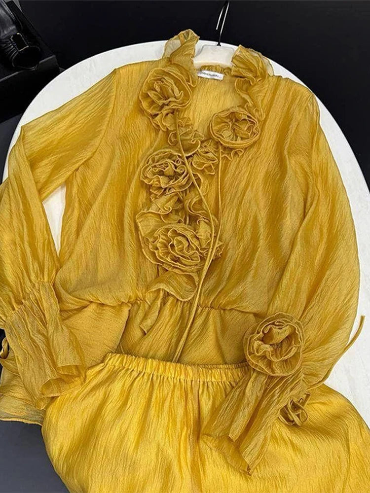 LIZAKOSHT  -  Ruffle Women's Shirt Shorts Sets 3D Flower V-neck Lace Up Long Sleeve Top Elastic Waist Short Pants two pieces set Lady Suits