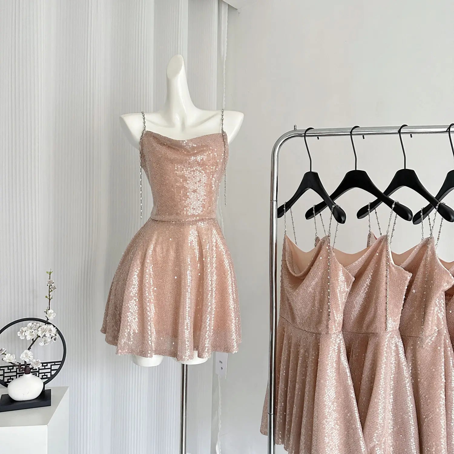 LIZAKOSHT - Sequins Dresses Sling High Quality Women Pink Dress Vintage Sleeveless Off Shoulder Y2k Elegant Party Waist Slimming Short Dress