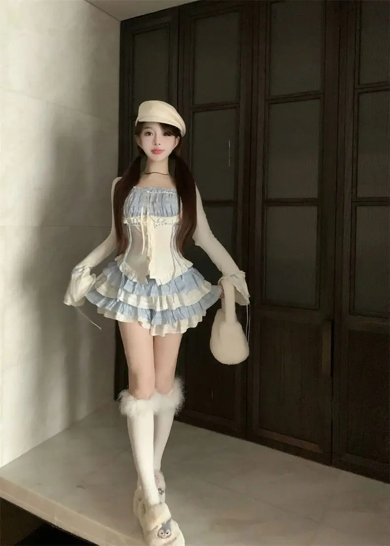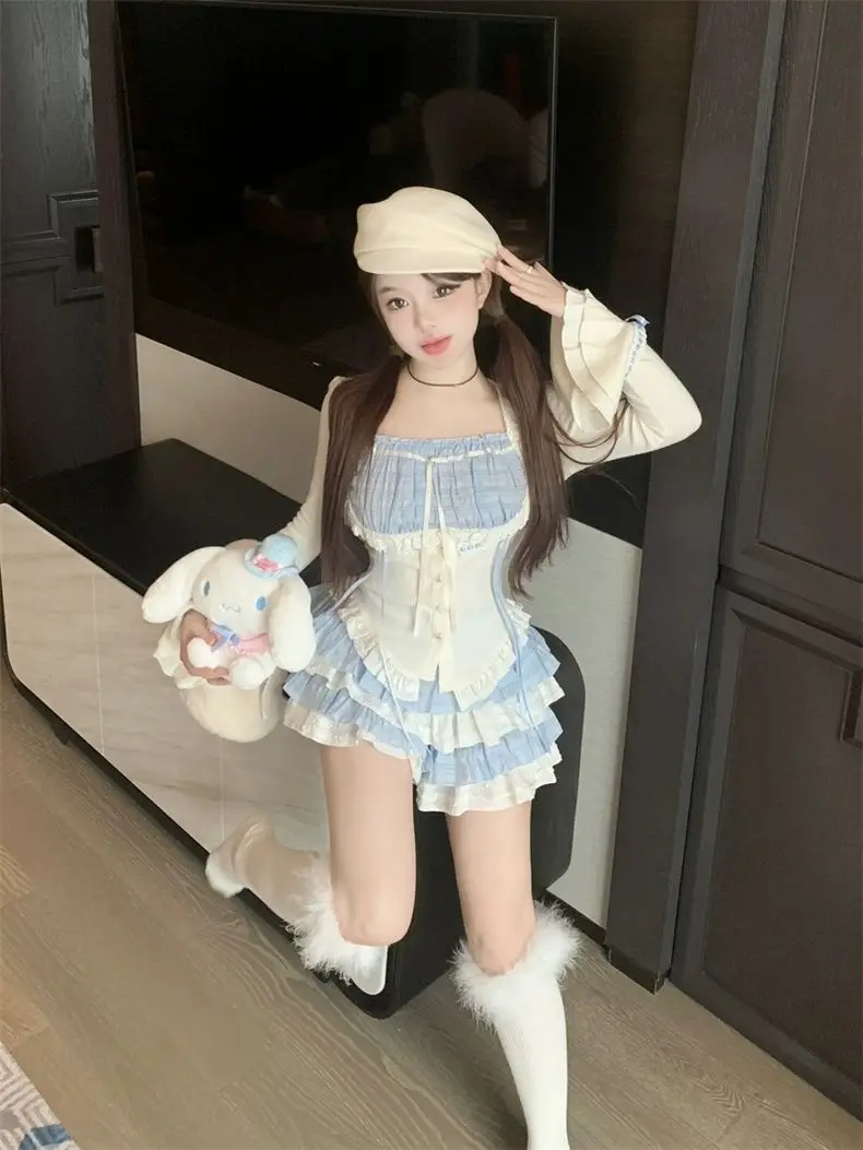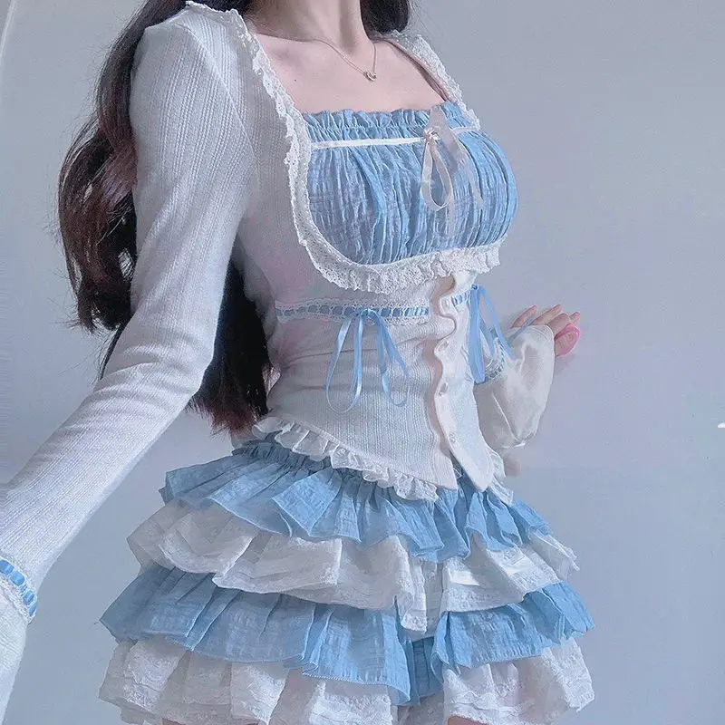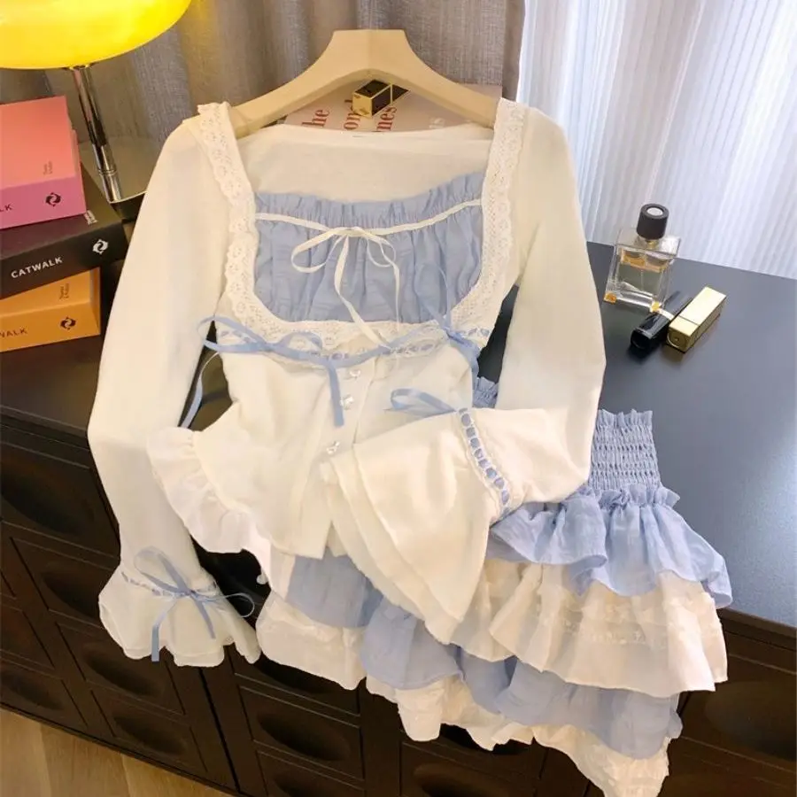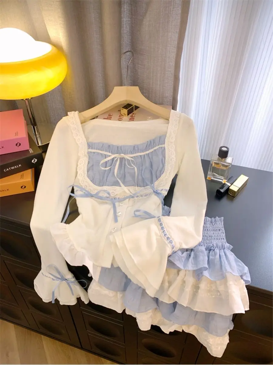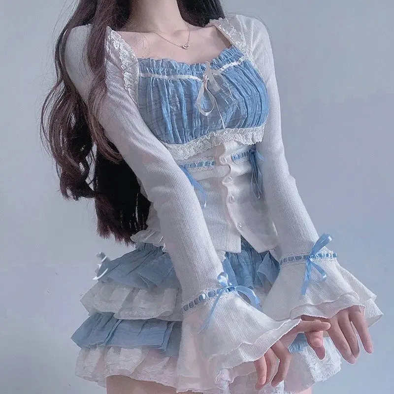 LIZAKOSHT - Set Skirt Crop Tops Blouse + Mini Skirts 2024 Autumn Casuall Japanese Style Y2k Vintage Lolita Kawaii Suits